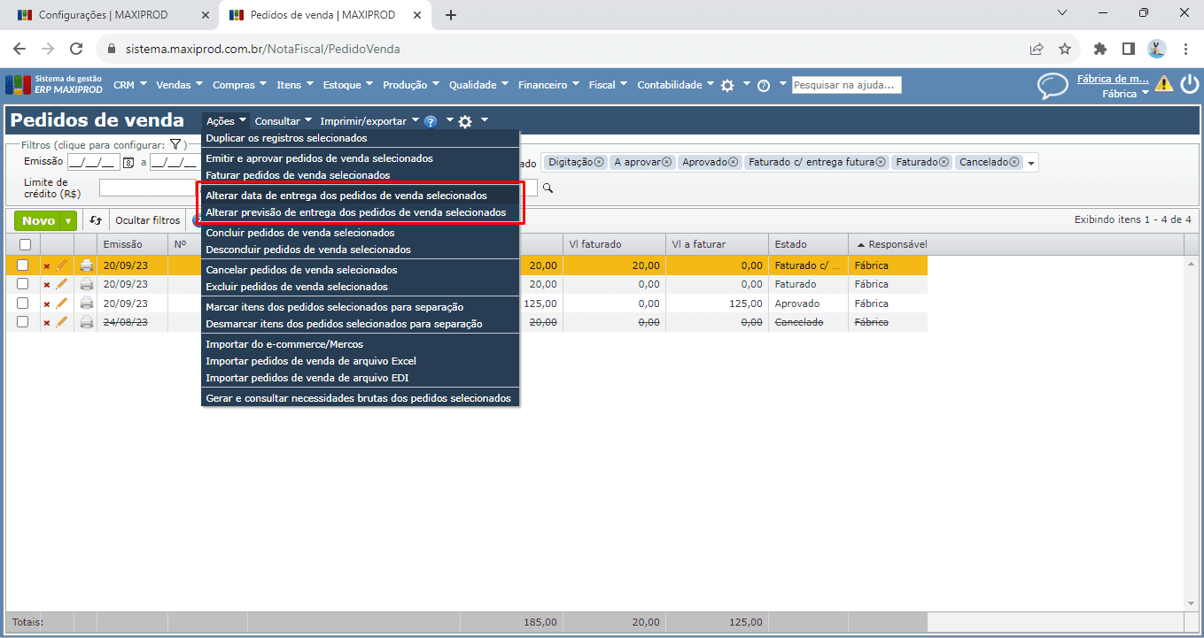 7) se a opção “Informar nos itens” estiver desmarcada nos respectivos campos do pedido de venda, então as datas de “Entrega” ou “Previsão de entrega” do pedido podem ser editadas. A edição deve ser feita através da grade de pedidos de venda, menu “Ações > Alterar data de entrega dos pedidos de venda selecionados” e/ou “Ações > Alterar previsão de entrega dos pedidos de venda selecionados”.