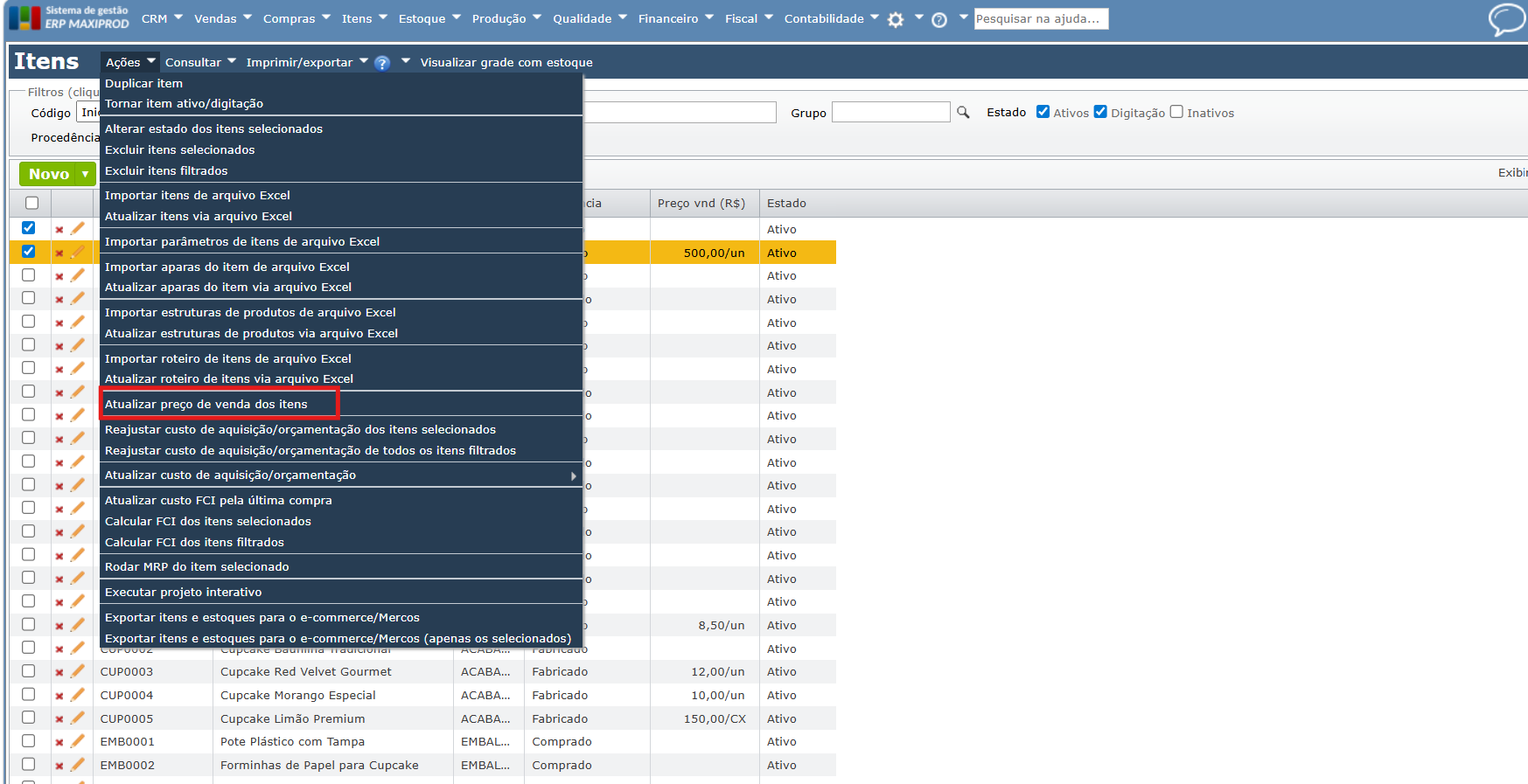 3) A seguir, marque os itens através da caixa de seleção e acesse o menu “Ações > Atualizar preço de venda dos itens””.