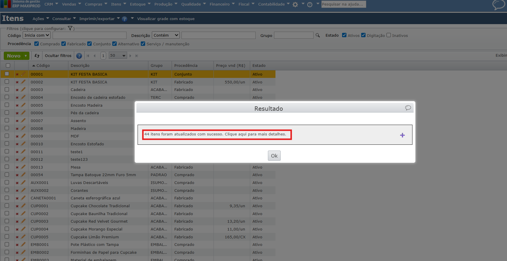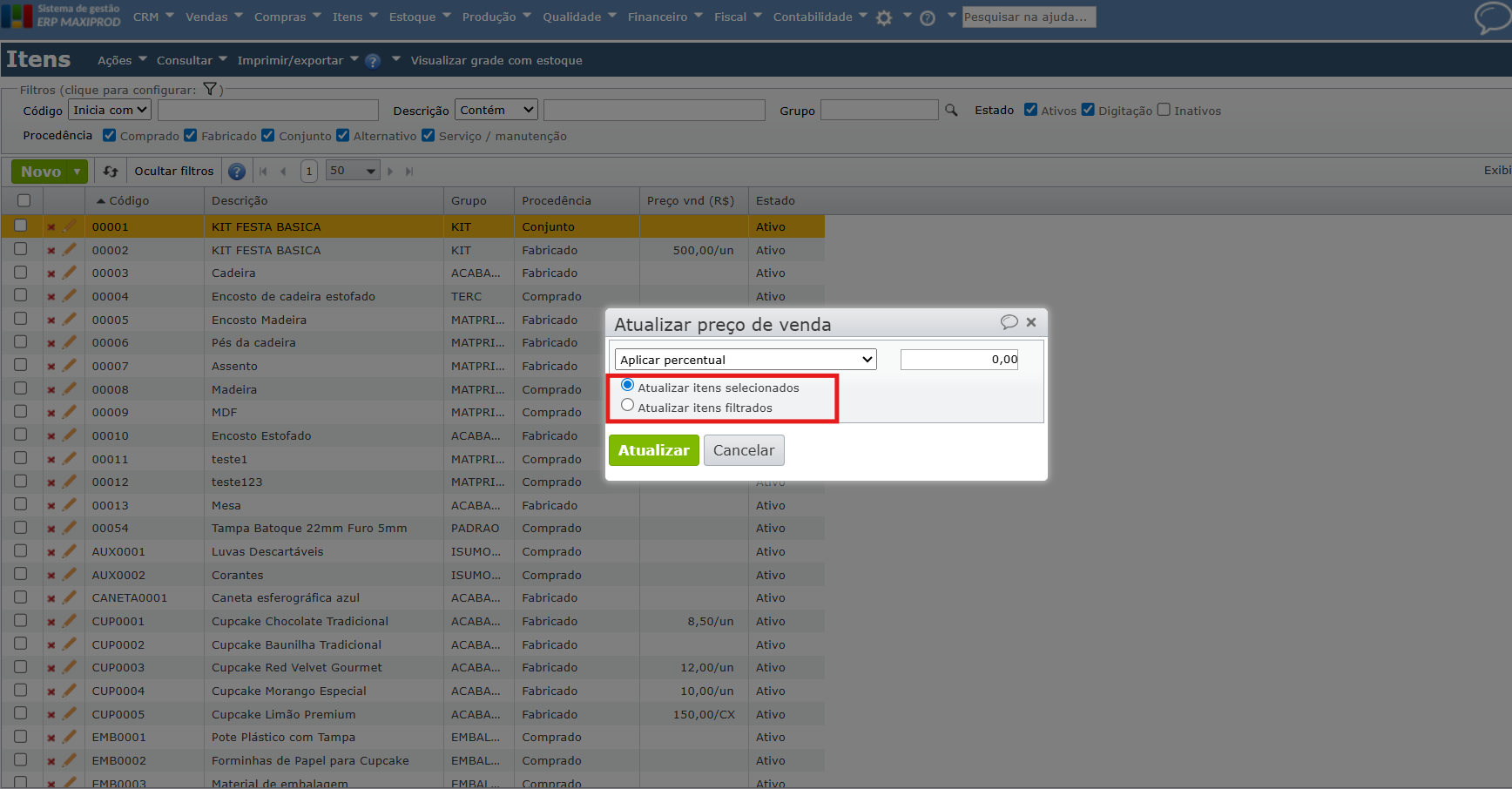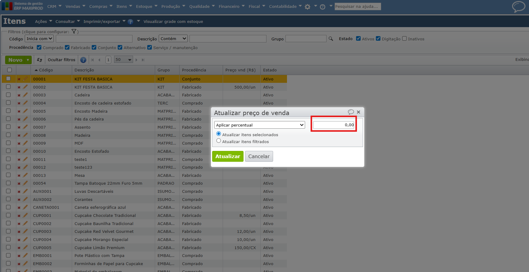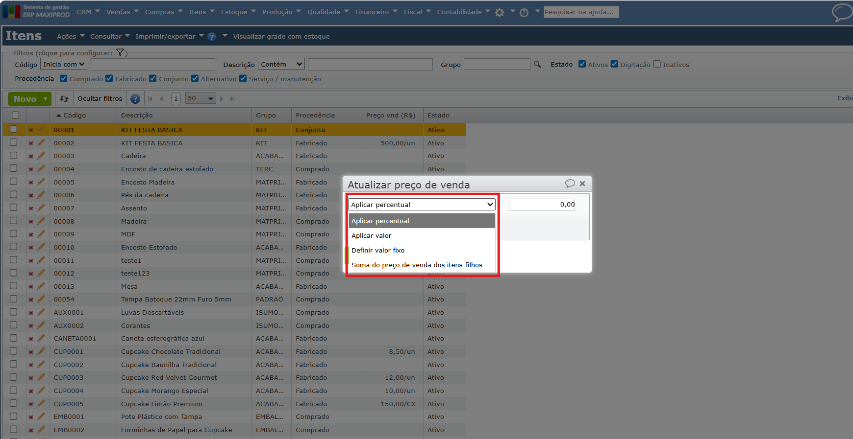 É possível atualizar simultaneamente os preços de venda de vários itens, aplicando percentuais, valores fixos ou calculando automaticamente pela soma dos preços de venda dos itens-filhos.