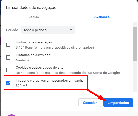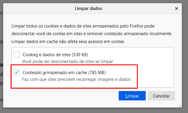 Se esse passo resolver o problema, desconsidere o passo b). Em alguns computadores, soluciona. Os dados armazenados em cache podem causar alguns problemas de leitura, e a solução é limpar os dados armazenados em cache do navegador.