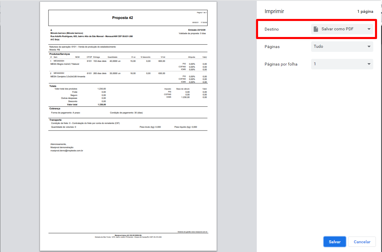 2) Abre-se uma tela para gerar impressão por meio de uma impressora conectada ao computador. Altere o campo “Destino” para “Salvar como PDF”.