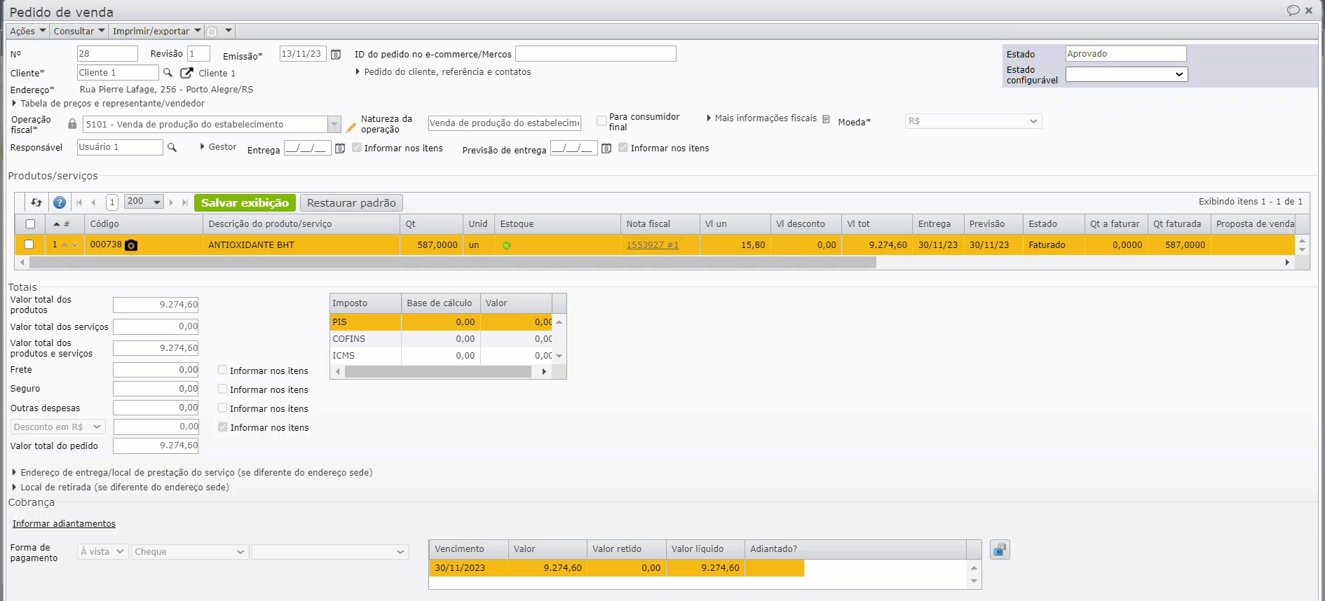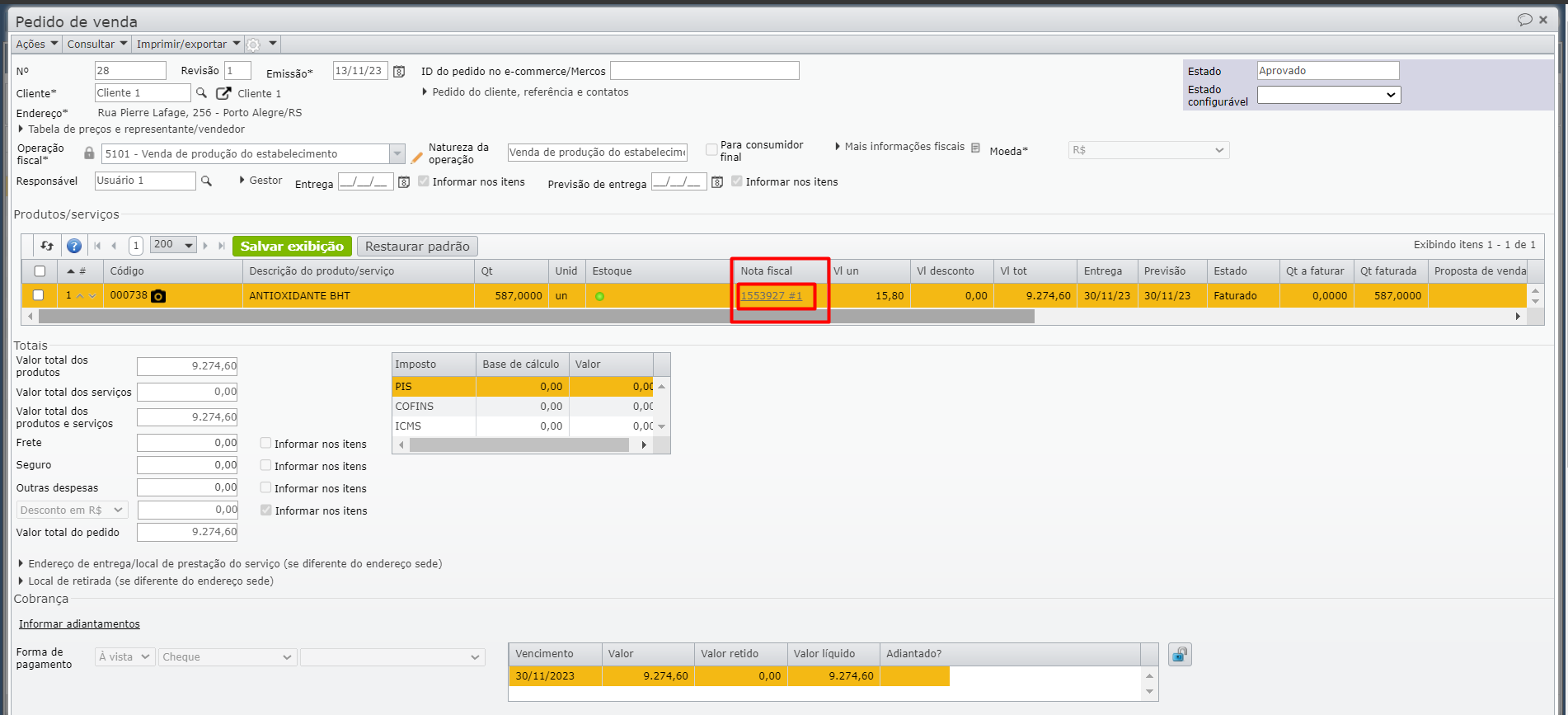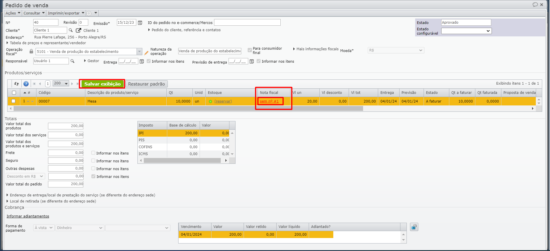 2) A seguir, clique no botão verde “Salvar exibição” para que a definição das colunas sejam salvas. A coluna “Nota fiscal” exibirá a referência entre o item do pedido e a NF gerada.