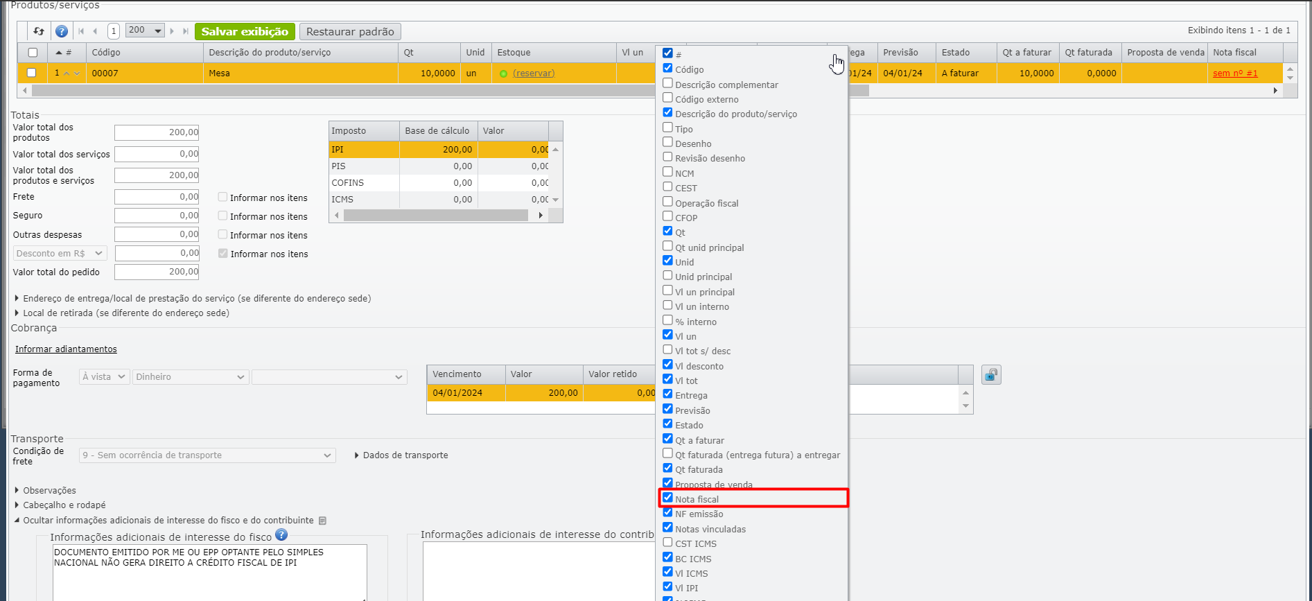 1) Na tela de edição do pedido, clique com o botão direito do mouse nas colunas da seção “Produtos/Serviços” e marque a opção “Nota Fiscal“.