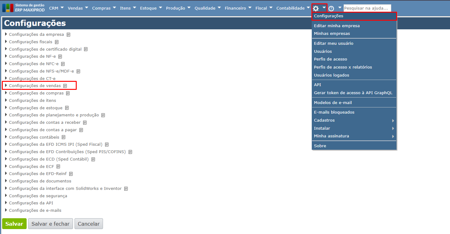 1) Acesse “Roda dentada > Configurações > Configurações de vendas”.