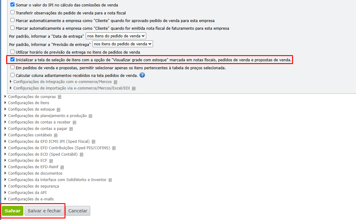 2) Habilite a opção “Inicializar a tela de seleção de itens com a opção de ”Visualizar grade com estoque” marcada em notas fiscais, pedidos de venda e propostas de venda.”. A seguir, clique no botão verde “Salvar” no final da tela.