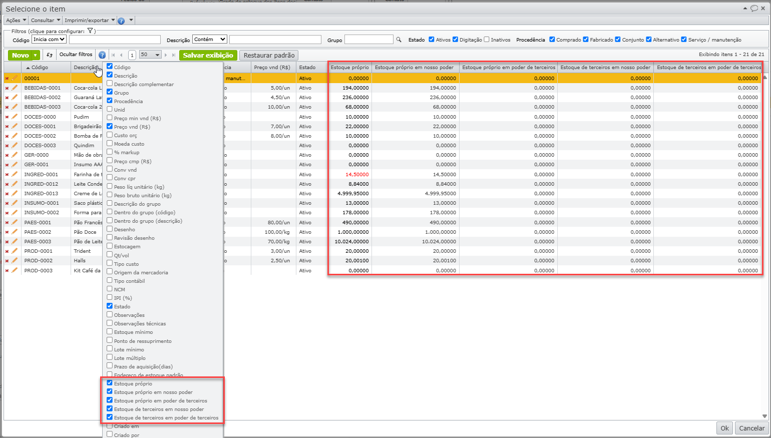 3) Agora podem ser habilitadas as novas colunas das telas de seleção do item. Para isso, clique com o botão direito do mouse sob o título das colunas e marque as colunas a exibir.