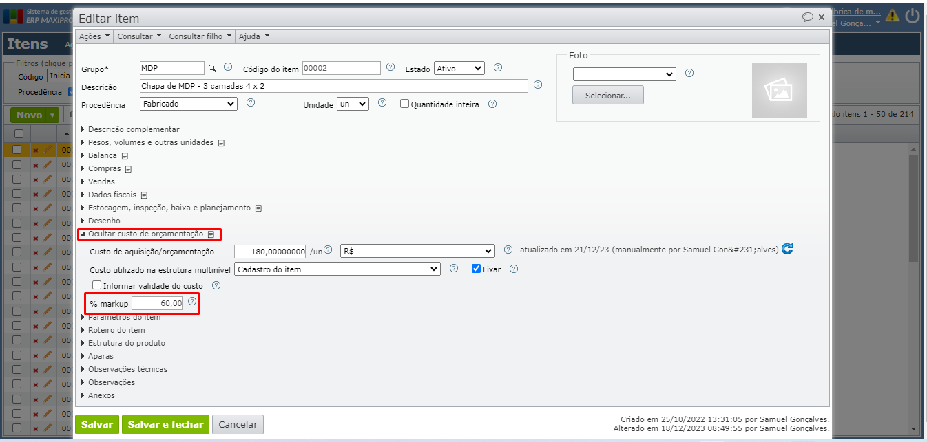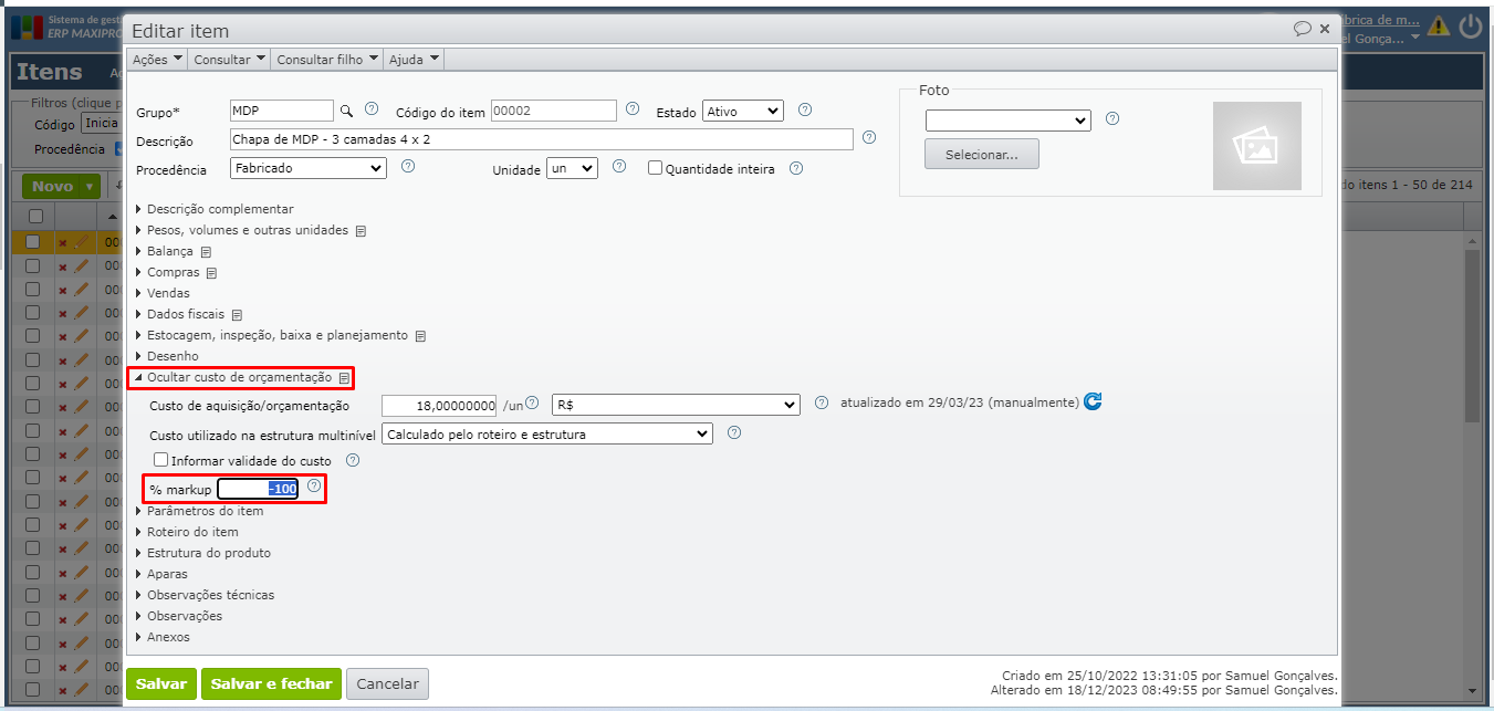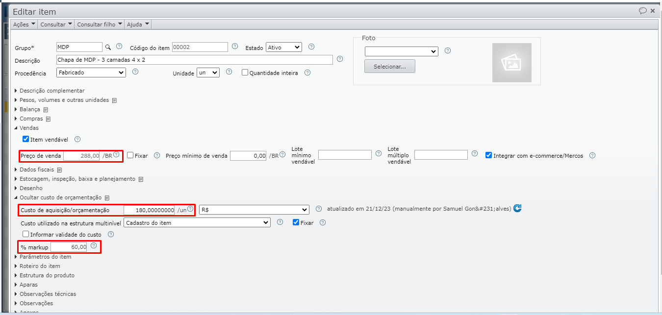 2) Ao desmarcar a opção “Fixar” do campo “Preço de venda”, o campo “% markup” torna-se editável na seção “Custo de aquisição/orçamentação”.