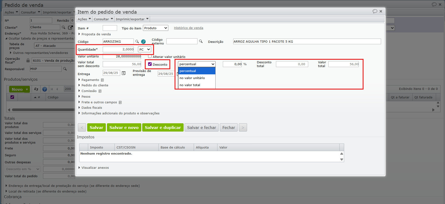 3) Ao inserir a quantidade do item no pedido é aberta a sessão de desconto, que pode ou não ser preenchida, ao desmarcar a caixa de seleção “Desconto” destacada na imagem abaixo.