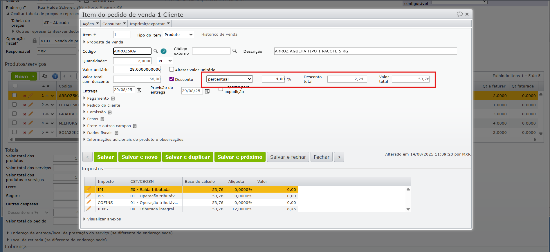 5) Além do valor estipulado pela tabela de preço, o usuário pode aplicar aos itens do pedido um desconto dentro do máximo estipulado pela tabela de preços.
