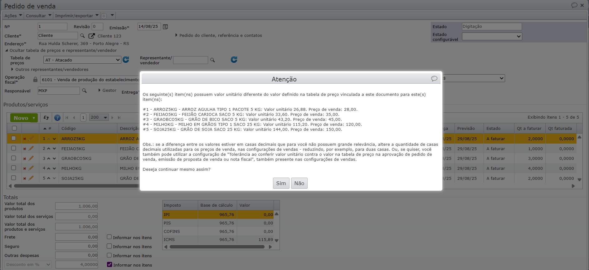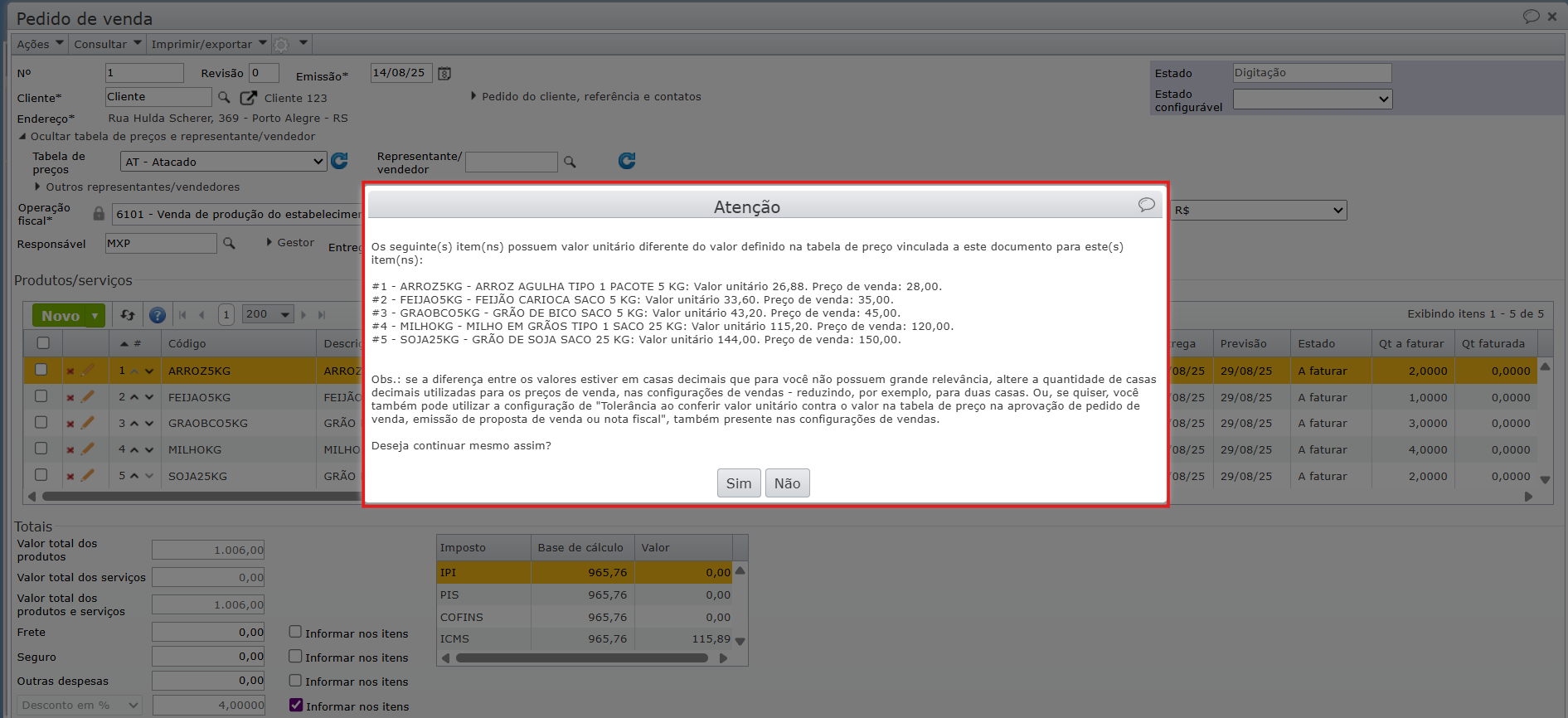 O objetivo desta mensagem não é bloquear a operação, mas sim alertar sobre essa divergência, permitindo que verifique se a diferença foi intencional ou se há necessidade de revisão. Caso a alteração tenha sido feita deliberadamente (por exemplo, um desconto concedido ao cliente), pode-se prosseguir sem problemas. Se, por outro lado, a diferença for não planejada, pode-se corrigir os valores antes de finalizar o documento.