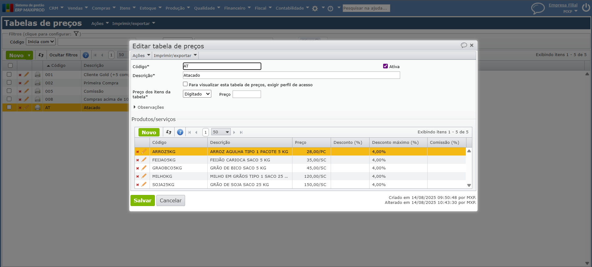 1) Supondo que a seguinte tabela de preço configurada para compras em atacado. Para saber mais sobre tabela de preço, clique aqui.