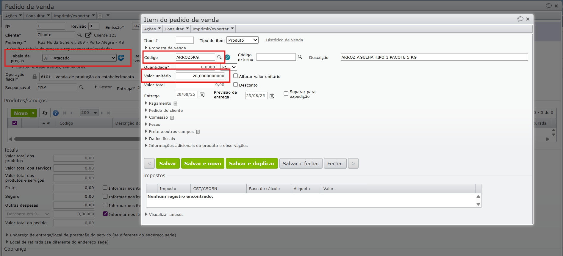 2) Ao inicializar um pedido de venda utilizando uma tabela de preço e adicionar um produto, o “Valor unitário” será preenchido automaticamente pelo preço configurado na tabela de preço, desconsiderando o preço de venda no cadastro do item.