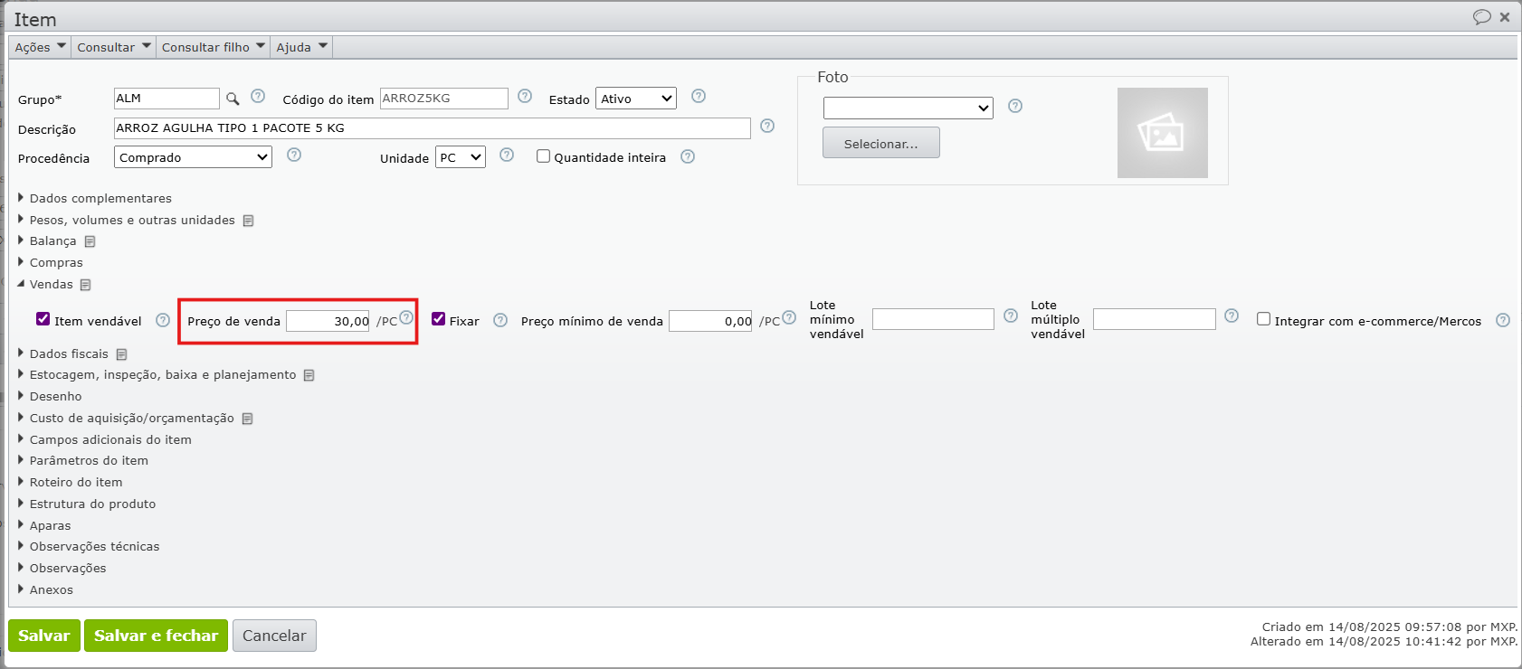 - Preço de venda na tabela de preço vinculada: 28,00/PC