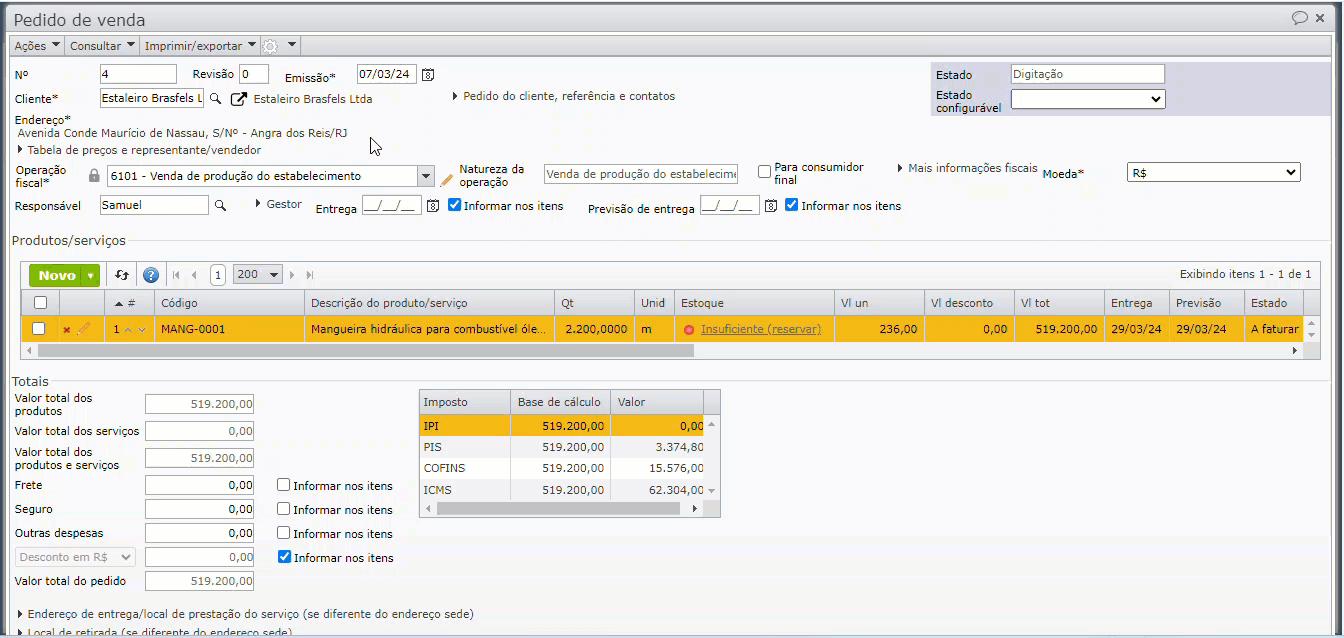 c) Mas, ao gerar um novo pedido, é duplicado o pedido anterior. Logo, o sistema inicializa o novo pedido com uma cópia dos dados do pedido de origem da duplicação, portanto sem os dados do representante/vendedor.