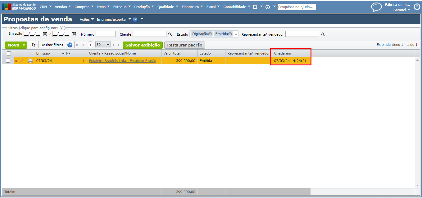 b) Na grade de propostas e/ou pedidos de venda, pode-se habilitar a coluna “Criado em” e ver a data de criação daquele documento. Para saber sobre como personalizar a visualização das telas, clique aqui.