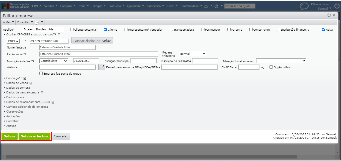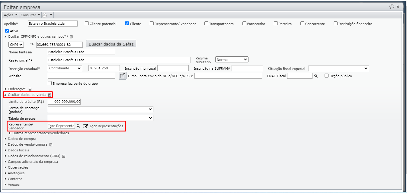 2) Outro motivo pode ter sido a criação da proposta ou pedido de venda, antes de “Salvar” a inclusão do representante/vendedor no cadastro da empresa cliente. Ou seja, o sistema somente considera as alterações no cadastro, se estas tiverem sido salvas.