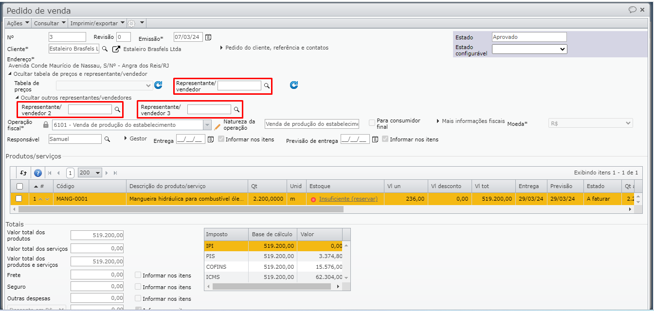 1) Verifique se o pedido de venda já não estava criado quando o representante/vendedor foi informado no cadastro do cliente. Se o pedido de venda ou a proposta que originou o pedido já estavam criadas, a inclusão do representante/vendedor no cadastro do cliente não se propaga automaticamente aos documentos de venda em andamento.