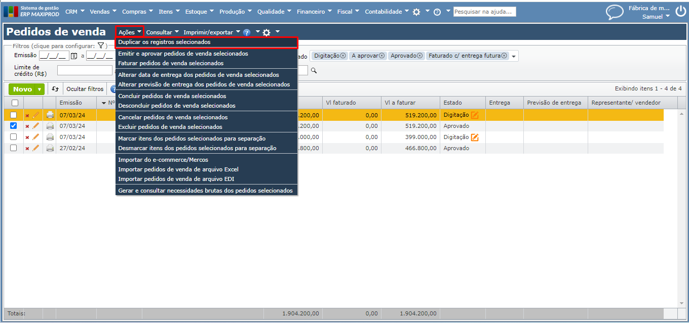 3) Se a proposta ou pedido de venda é criada duplicando um registro anterior, os dados serão inicializados conforme o registro utilizado para duplicação.