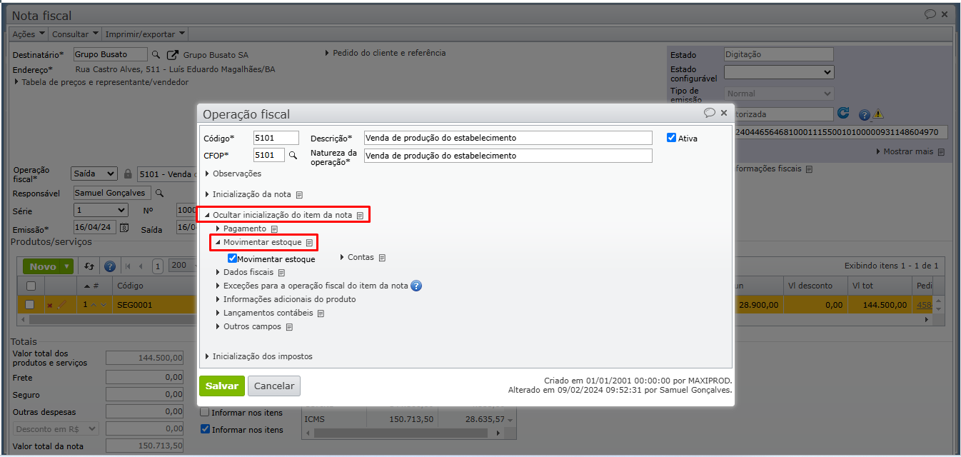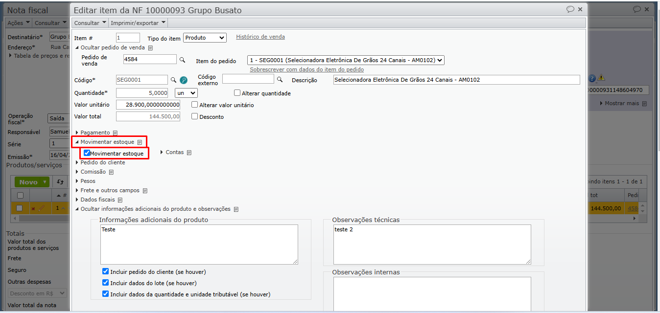 1) A opção “Movimentar estoque” de um item da nota fiscal define se a emissão da nota fiscal movimentará o estoque daquele item.