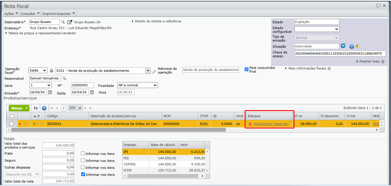 Veja a coluna “Estoque” na edição de uma nota, quando o item ainda estar indisponível no estoque. Como, por exemplo, quando a ordem de produção ainda se encontra em andamento.