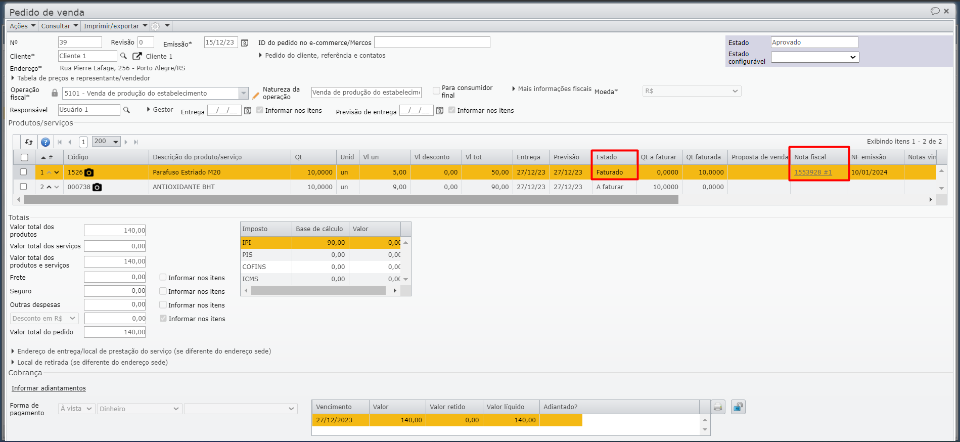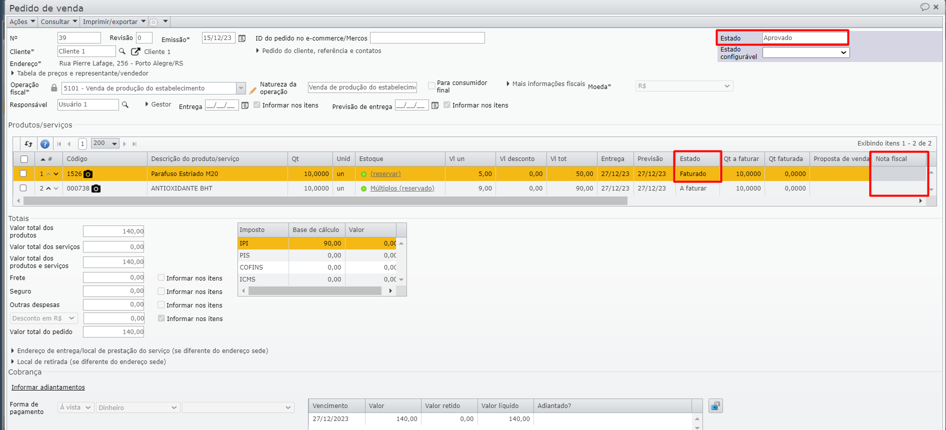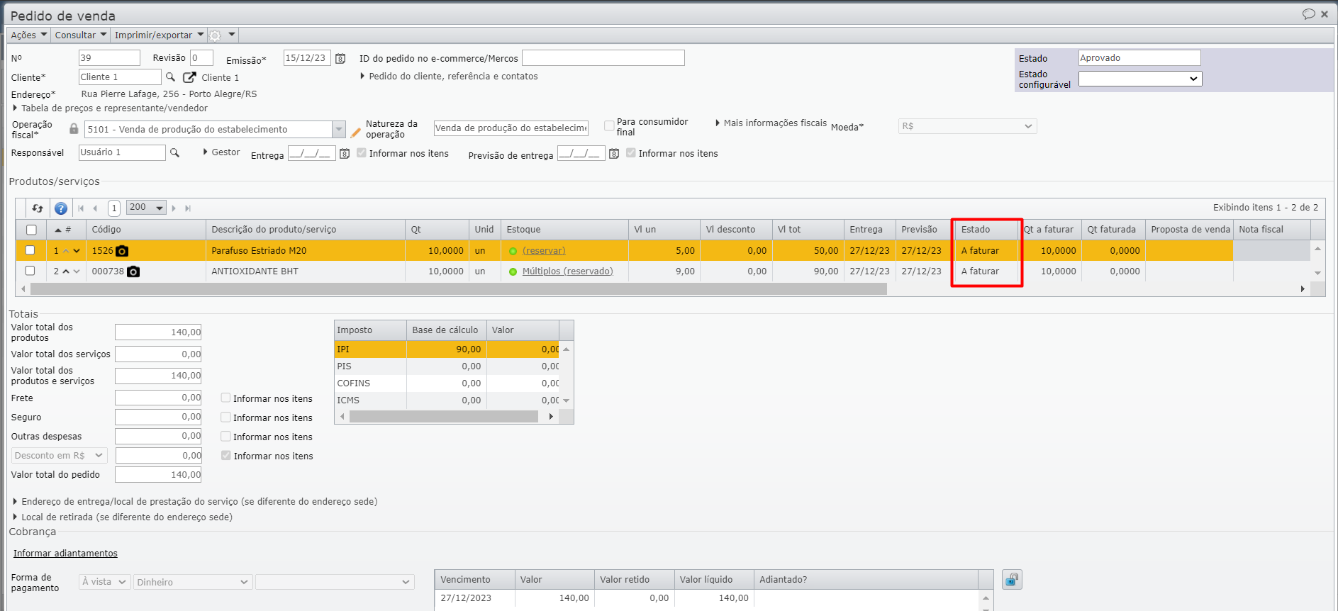 a) Um pedido de venda tem dois itens, ambos no estado “A faturar“.