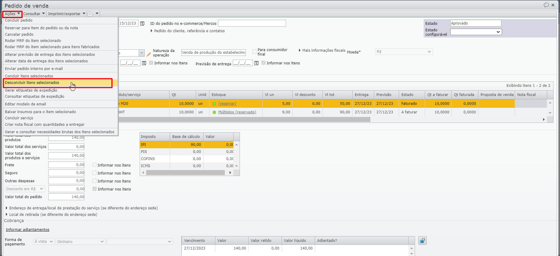 b) o item “1” é concluído manualmente, através do menu “Ações >  Concluir itens selecionados”, fazendo com que seu estado passe a “Faturado”, porém, sem vínculo com qualquer NF. O estado do pedido continua como “Aprovado”.