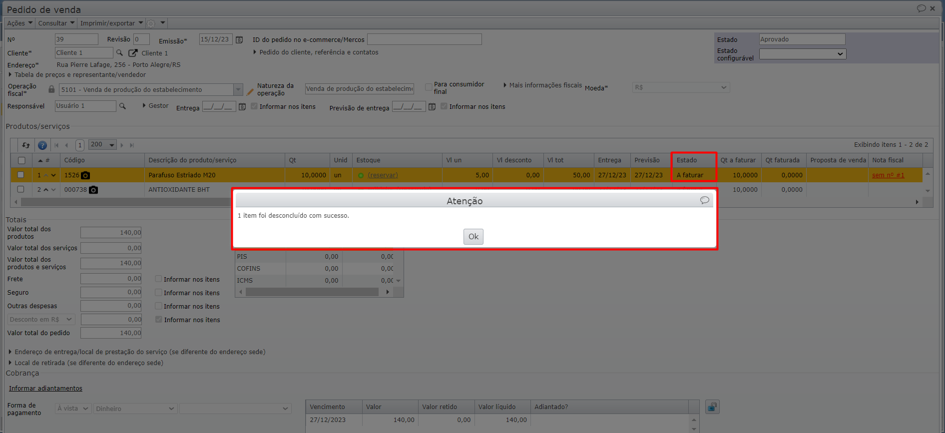 2) Será exibida uma mensagem de “Sucesso“, informando que o estado o item foi desconcluído, e seu estado será alterado para “A faturar”.
