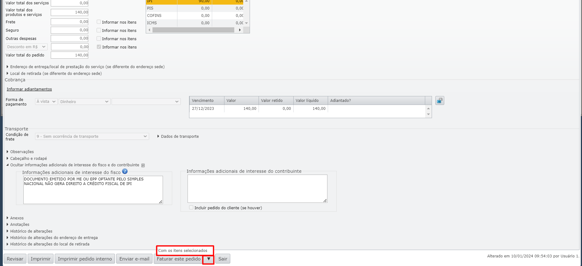 b) Uma NF será gerada exclusivamente com os itens selecionados. Após a emissão da NF, o estado dos itens inseridos na NF será atualizado no pedido de venda para “Faturado“, agora com uma NF associada.