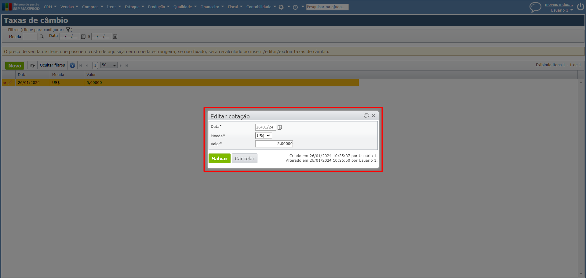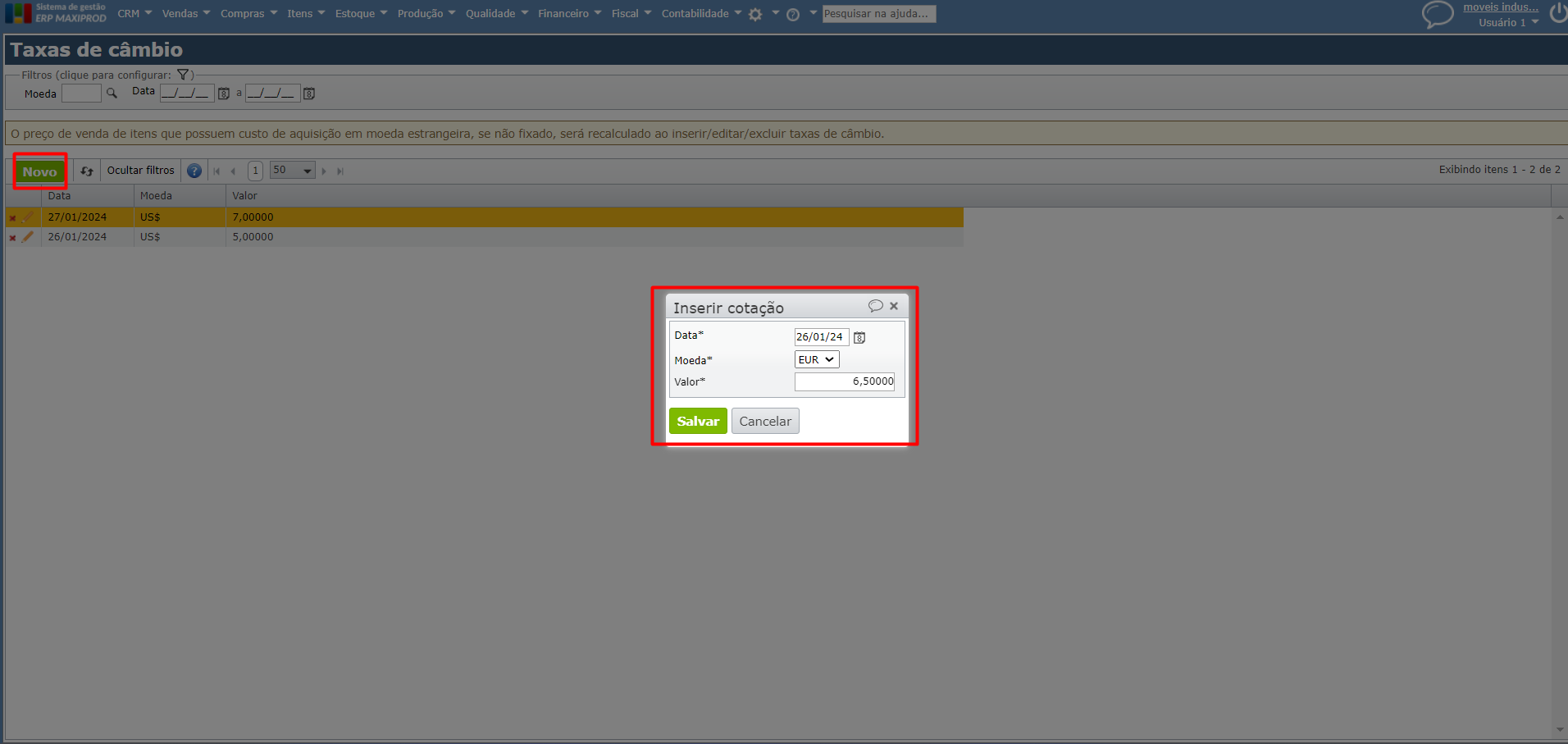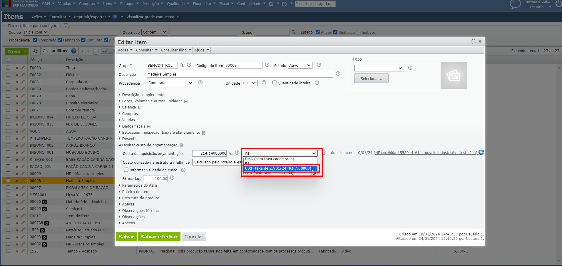 c) Ao tentar selecionar a taxa de câmbio no item, será exibida a última taxa cadastrada para a conversão, no caso a do dia “27/01/2024”, ainda que a data vigente seja “26/01/2024”.