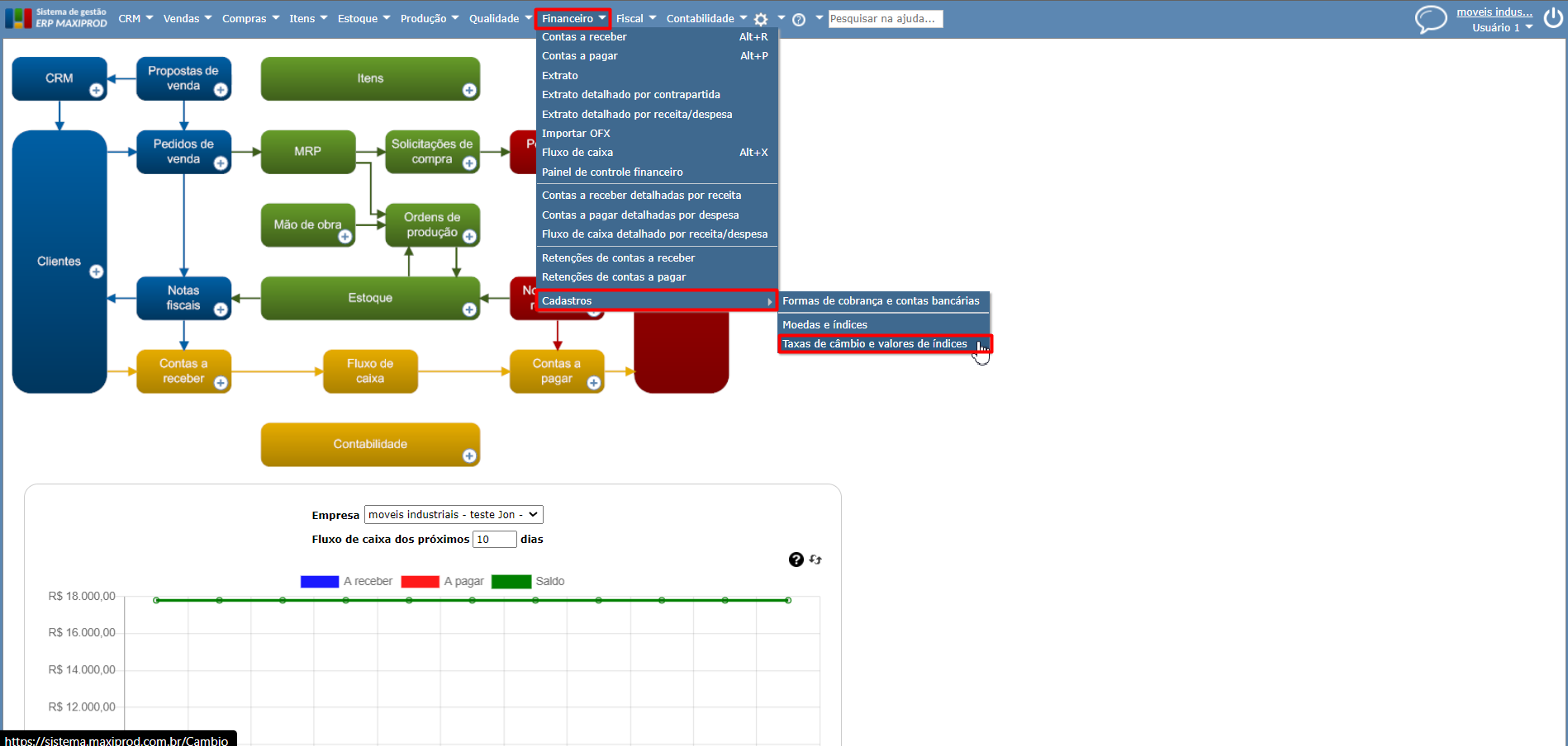 1) Acesse o menu “Financeiro” > “Cadastro” > “Taxas de câmbio e valores de índices”.