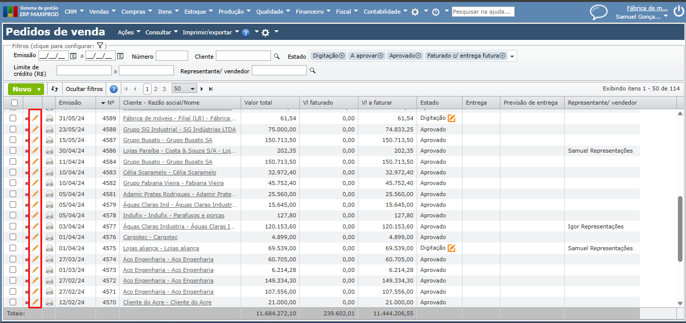 2) Na grade de pedidos de venda, clique no ícone do lápis para editar o pedido desejado.