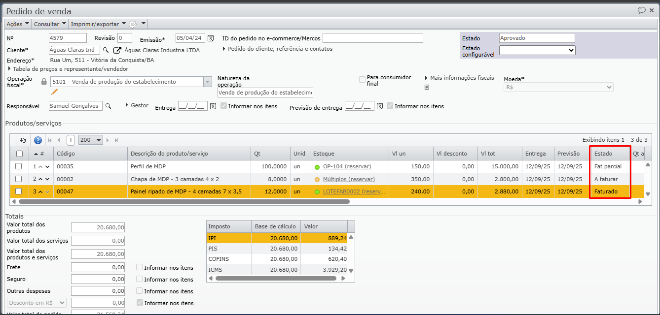3) Na edição do pedido de venda, observe a grade de itens. No exemplo abaixo, o primeiro item do pedido está no estado faturado parcialmente, o segundo item no estado a faturar e o terceiro item no estado faturado.