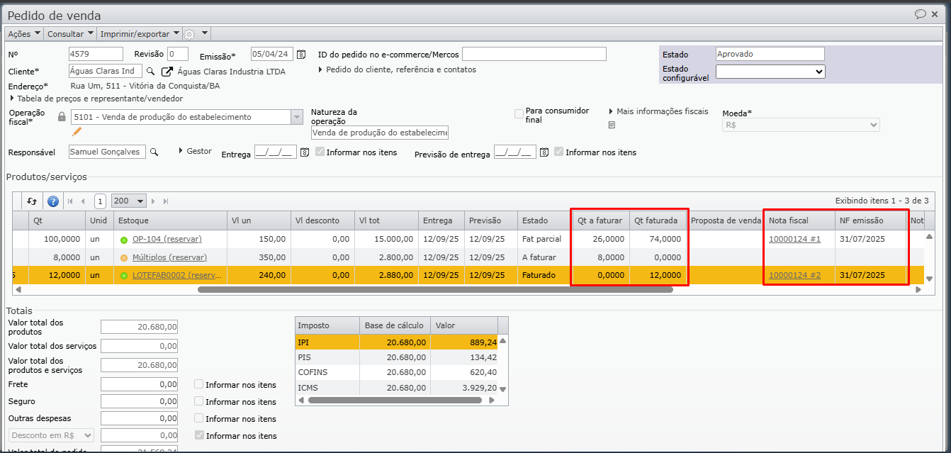- A(s) nota(s) fiscal(is) emitida(s) para o pedido e as quantidades faturadas.