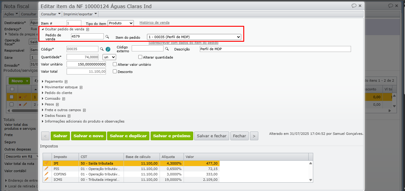 b) Após vincular manualmente o item da nota ao item do pedido, clique para “Salvar” as alterações e emita a nota fiscal novamente. Para saber mais sobre desfazer emissão de NF, clique aqui.