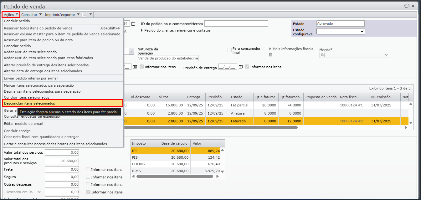 6) Existem situações onde o item do pedido de venda foi retornado ao estado “A faturar” ou “Faturado parcial” em razão de ter sido desconcluído manualmente. Esta ação pode ser executada sobre o pedido, onde força o seu estado de volta para “Aprovado” e pode também ser executada sobre os itens do pedido, retornando o estado dos itens para “Faturado parcial”. Para saber mais, clique aqui.