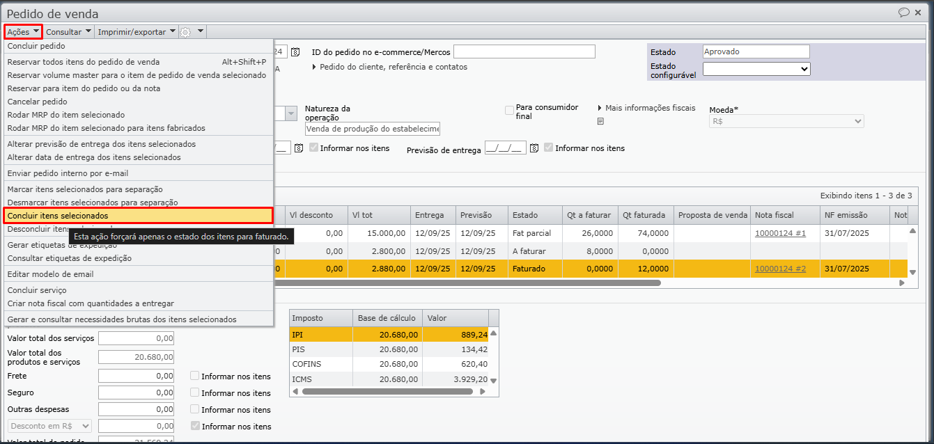 a) Neste caso, para concluir manualmente o item do pedido de venda, isto é, forçar o seu estado para “Faturado”, selecione-o na grade e vá em “Ações > Concluir itens selecionados”.