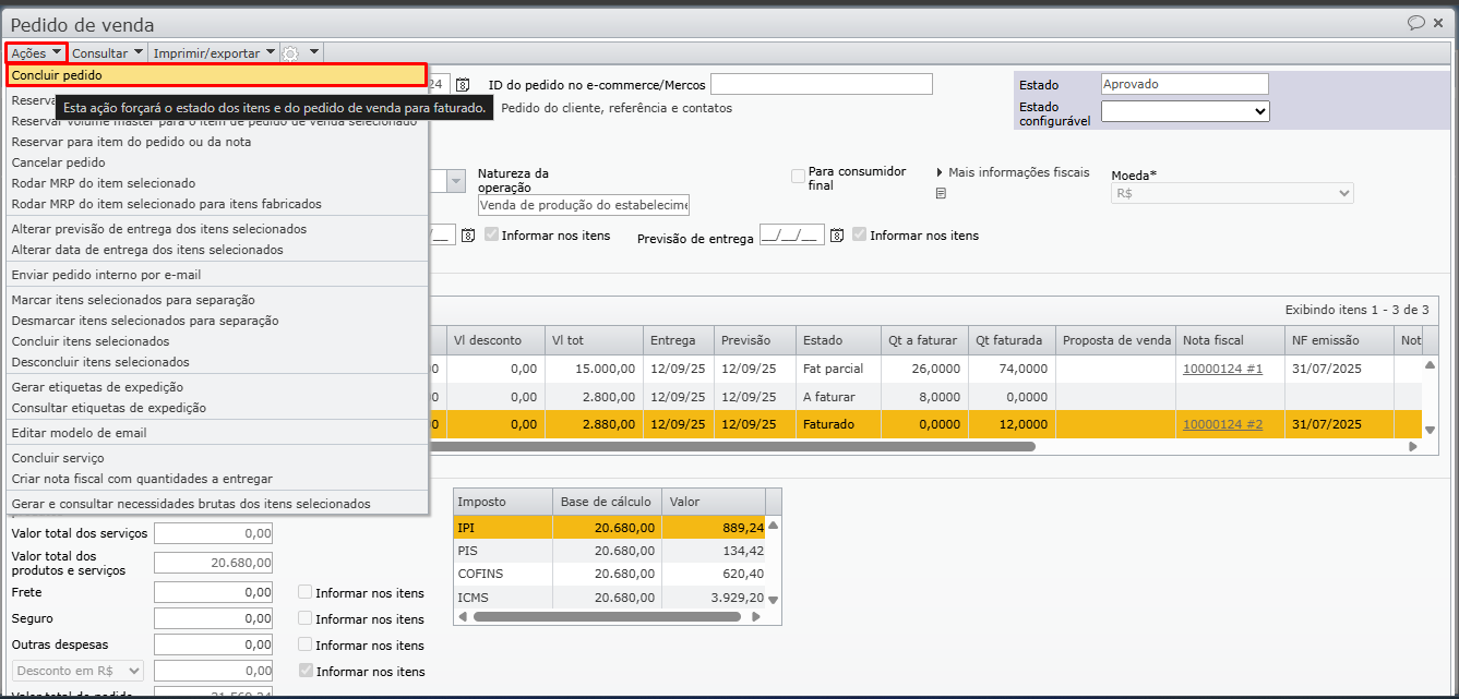 b) O mesmo pode ser executado sobre o pedido de venda por completo, indo em “Ações > Concluir pedido”. Esta ação força o estado dos itens e do pedido de venda para “Faturado”.