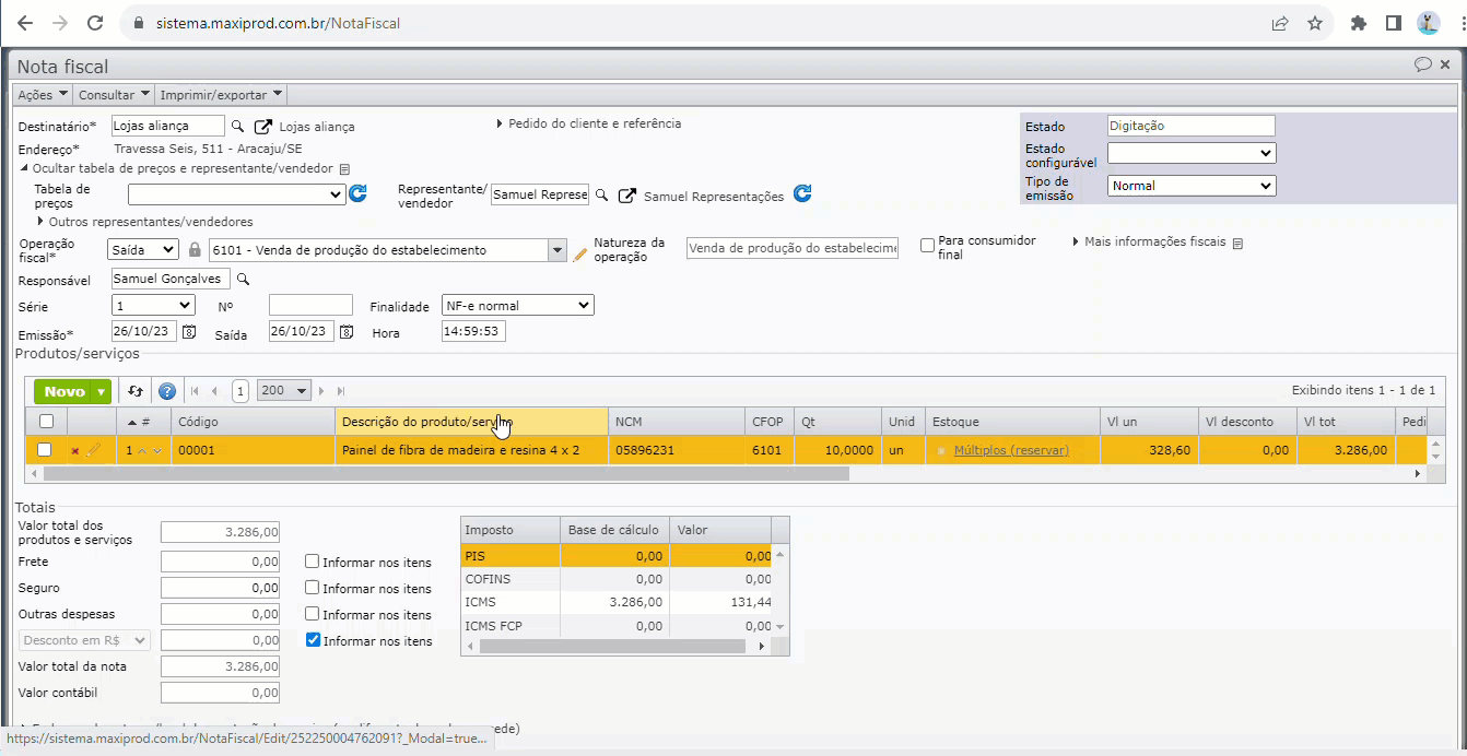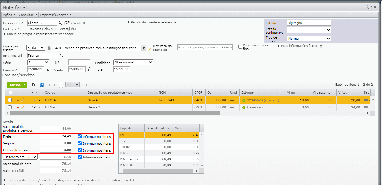 3) Ao preencher o valor do campo “Frete unitário”, o sistema multiplica este valor pela quantidade do item e exibe o resultado no valor “Frete total”.