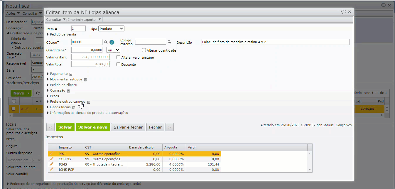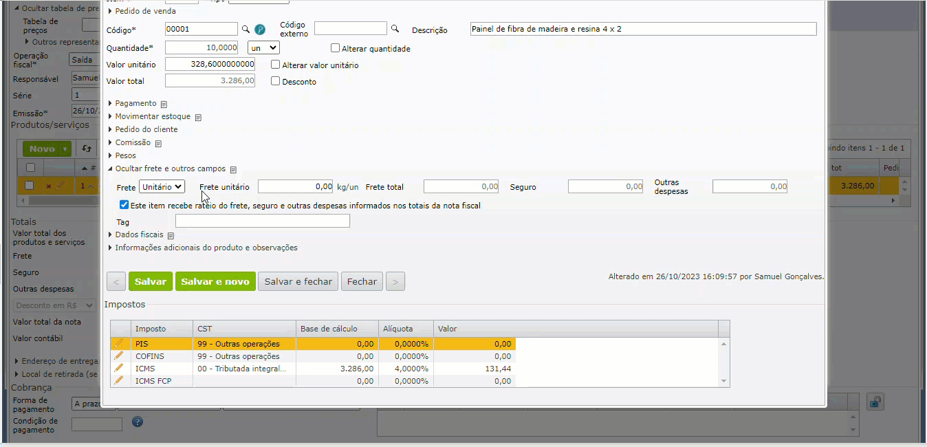 2) A seguir, acesse a edição do item, expanda a seção “Frete e outros campos” e altere o campo “Frete” de “Total” para “Unitário”. Ao fazer isso, o sistema passa a exibir o campo “Frete unitário”.