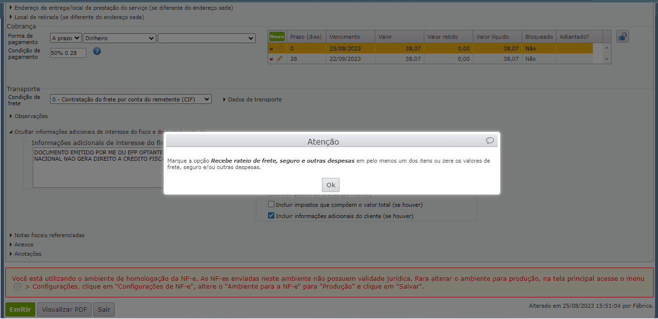 “Marque a opção Recebe rateio de frete, seguro e outras despesas em pelo menos um dos itens ou zere os valores de frete, seguro e/ou outras despesas.”