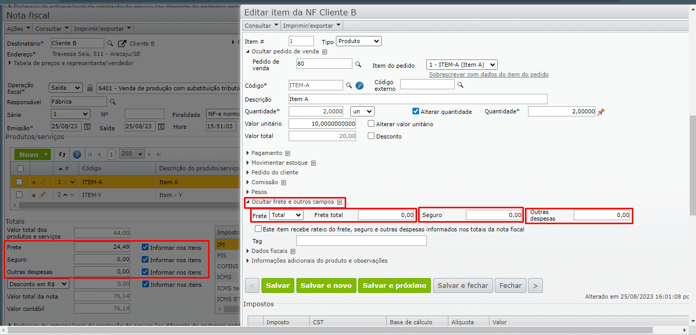 5) Na edição de uma proposta, pedido de venda ou nota fiscal, ao lado dos campos “Frete”, “Seguro” e “Outras despesas” há uma opção chamada “Informar nos itens”. No entanto, esta opção apenas determina se os campos correspondentes na aba “Frete e outros campos” da edição do(s) item(ns) serão editáveis pelo usuário.