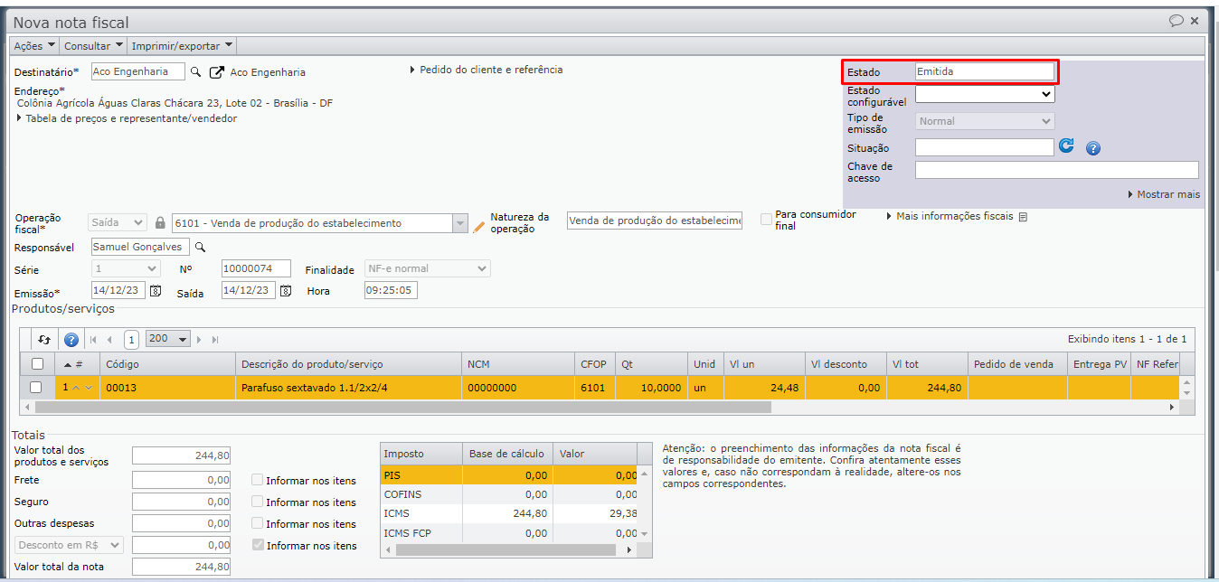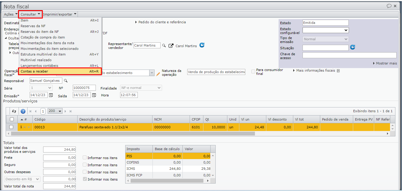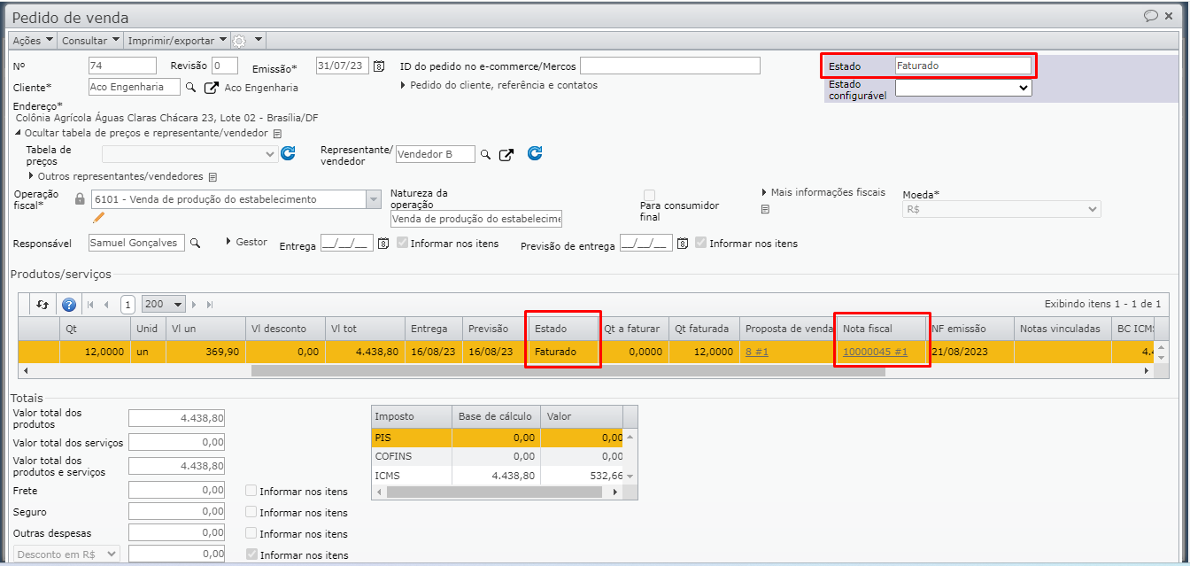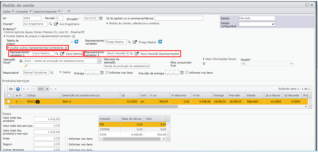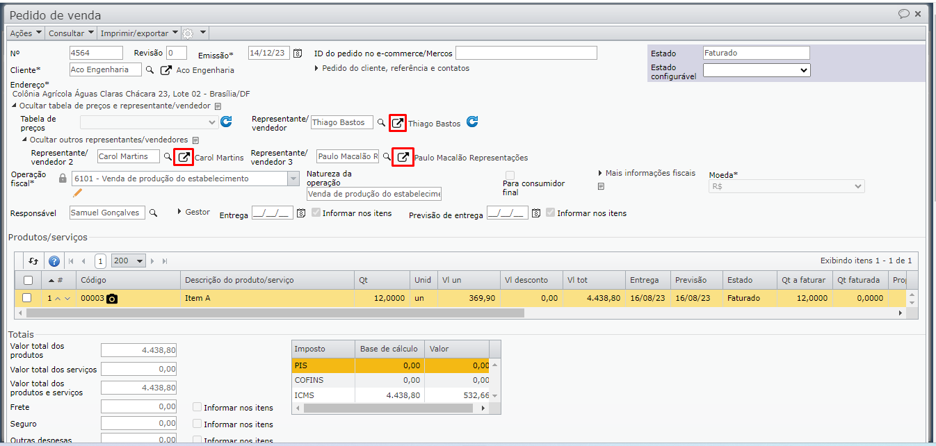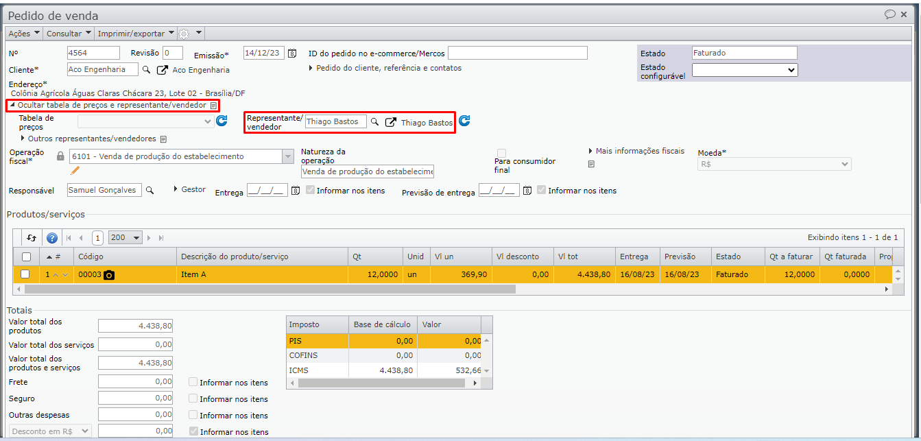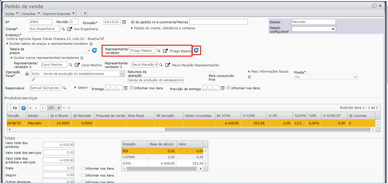 1) Verifique na edição do pedido de venda e/ou NF se os campos “Representante/vendedor” estão preenchidos. Na edição do documento de venda, os campos de representante/vendedor estão na seção “Tabela de preços e representante/vendedor”.