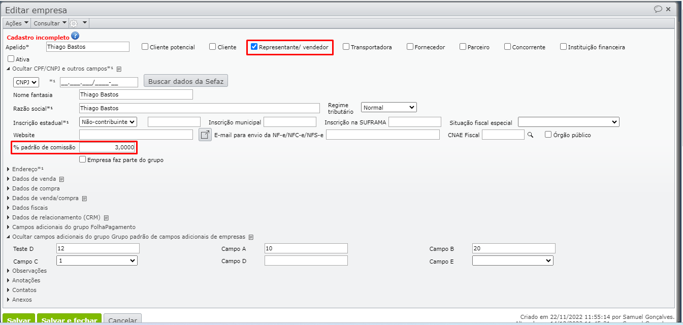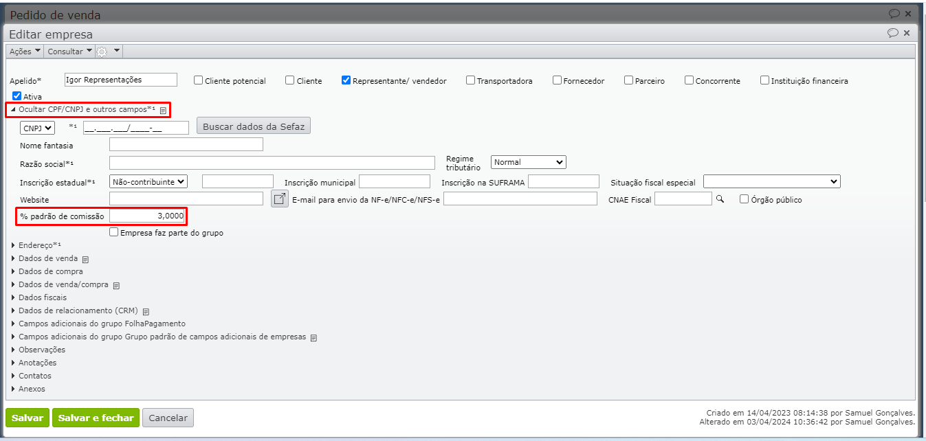 2) Será aberta a tela de edição do cadastro do representante/vendedor. Verifique se o campo “% padrão de comissão” está preenchido. O percentual informado neste campo inicializa o cálculo/recálculo da comissão nos itens do pedido e/ou NF, sendo visível quando o tipo “Representante/vendedor” está marcado.