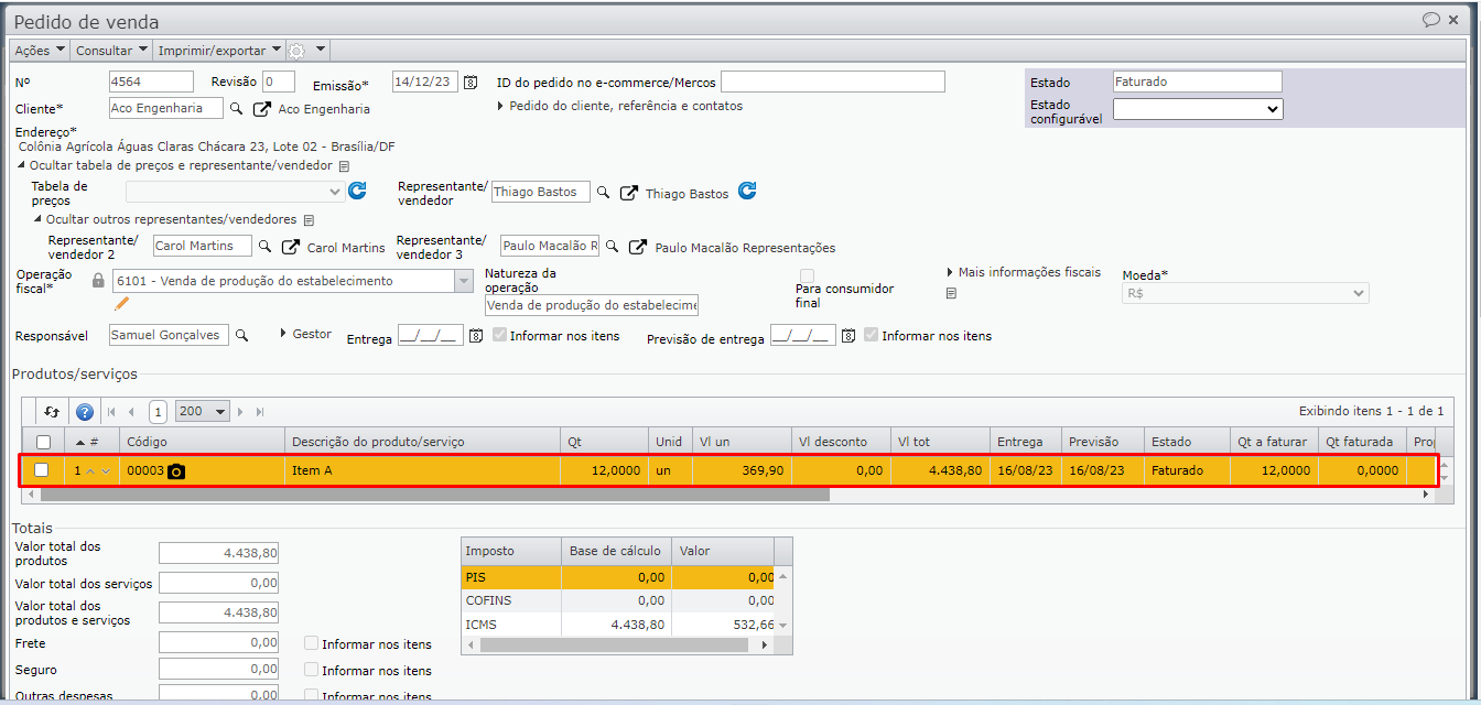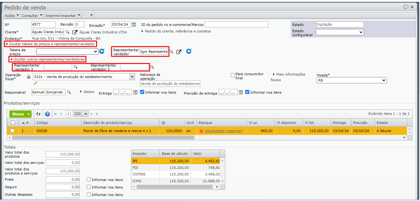 4) Com o pedido de venda em estado de “Digitação”, pode-se inserir ou alterar o representante/vendedor do pedido e/ou editar o item e preencher os campos manualmente.