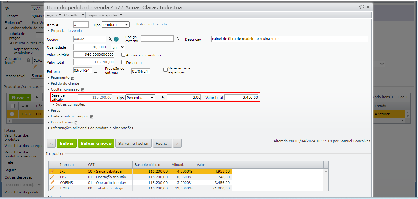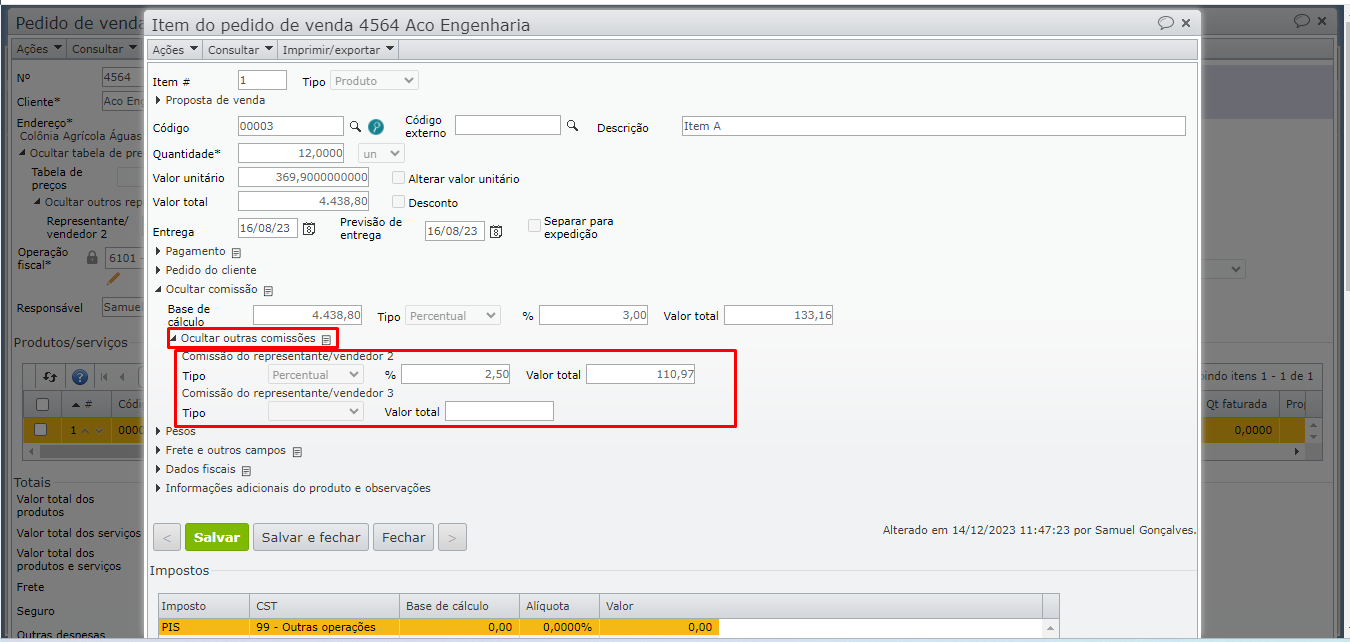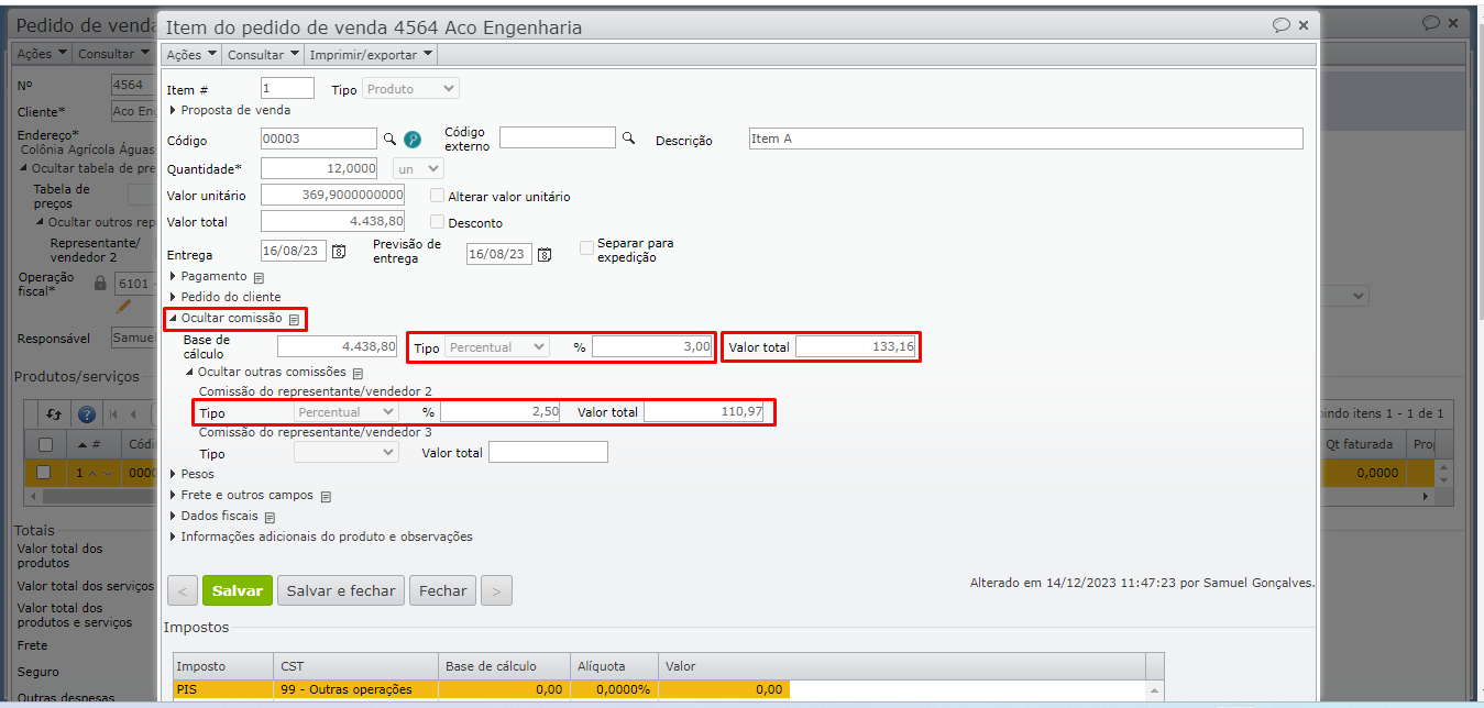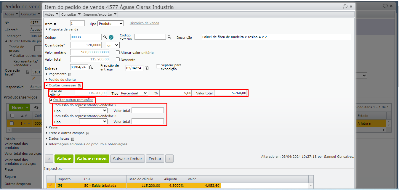 2) Se o representante/vendedor está informado no pedido de venda do adiantamento, verifique se os valores de comissão estão presentes nos itens do pedido. Para isso, na edição do item do pedido, expanda a seção “Comissão” e verifique se a base de cálculo está sendo calculada, além do tipo e valor total. Se existe mais de um representante/vendedor, expanda a seção “Outras comissões”.