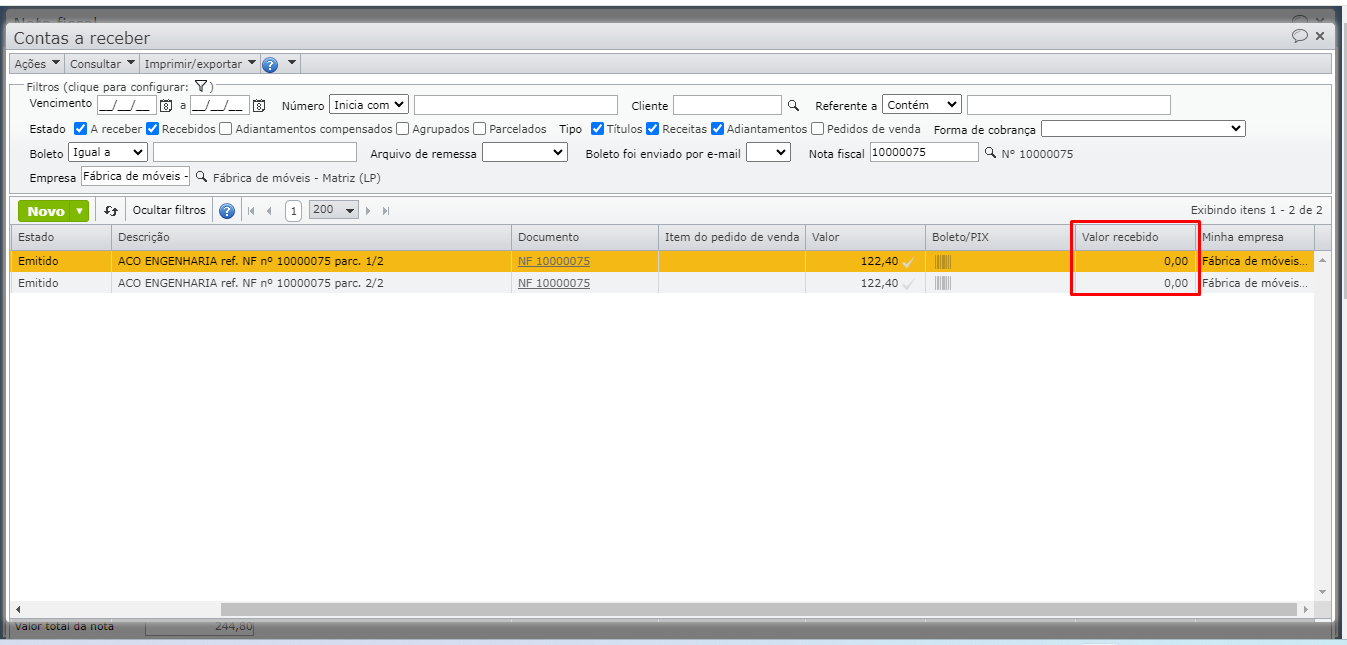 2) Na tela de contas a receber, habilite a coluna “Valor recebido” e veja se foi recebido algum valor recebido dos títulos. Veja como personalizar a visualização das telas, clicando aqui.