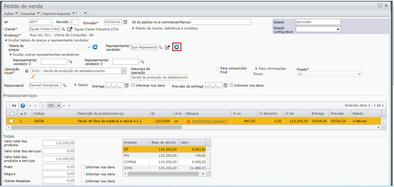 4) Se a comissão do representante/vendedor não está sendo calculada nos itens da nota ou pedido de venda, retorne à tela de edição da NF-e/pedido de venda e utilize o botão azul “Atualizar” ao lado do campo “Representante/vendedor”.