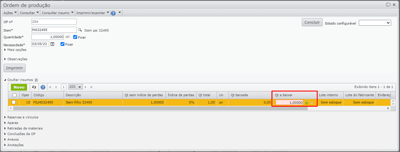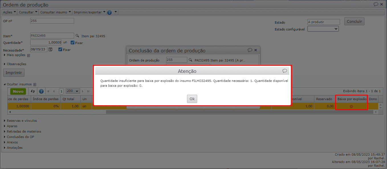 “Quantidade insuficiente para baixa por explosão do insumo FILHO32495. Quantidade necessária: 1. Quantidade disponível para baixa por explosão: 0.”