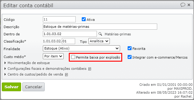 - Procure a conta contábil na qual o estoque está inserido e abra sua edição através do lápis de edição ou duplo clicando sobre o registro. Basta marcar a opção “Permite baixa por explosão” e salvar a conta para liberar a conclusão da ordem de produção e baixa por explosão do insumo: