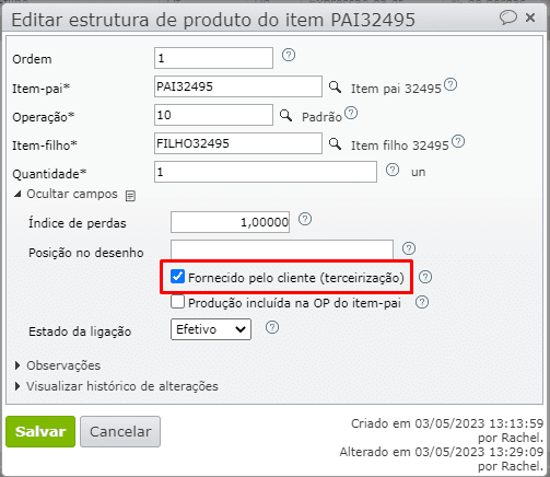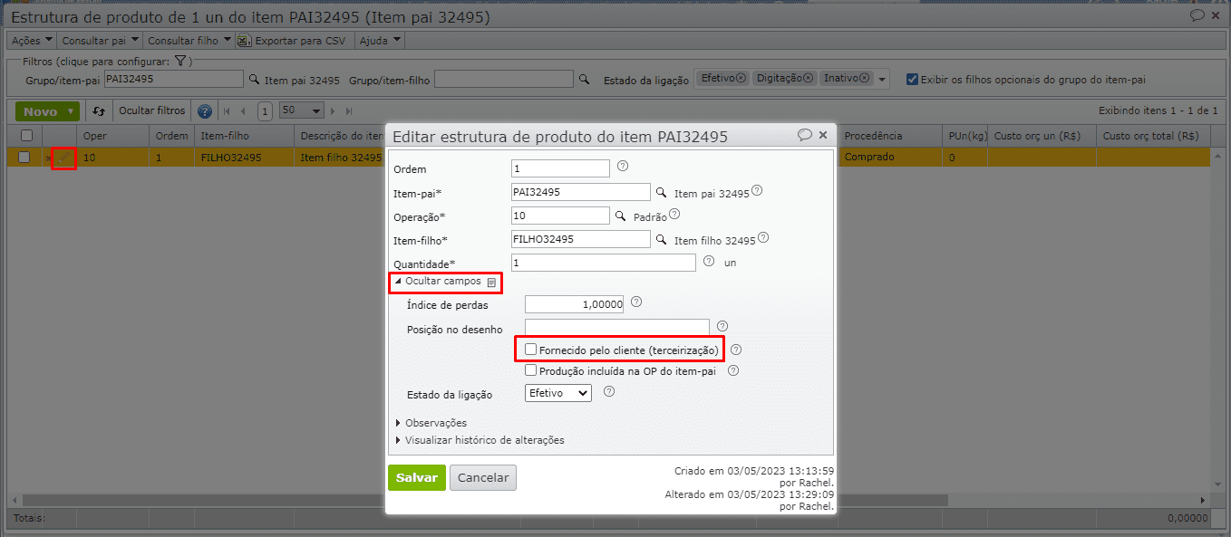 - Após selecionar este item-pai, acesse o menu “Consultar” > “Estrutura de produto” e edite a ligação, desmarcando a configuração “Fornecido pelo cliente (terceirização)”: